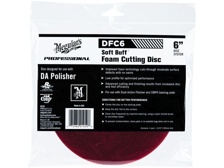 Meguiar's Foam Cutting Disc är en grov polerskiva med förbättrad skumteknik som kan skära igenom måttliga ojämnheter i lackytan utan att skapa nya virvlar. Låg profil för optimerad prestanda, med avancerad kapning och finish tack vare ökad skiv- och polermaskineffektivitet i form av Dual Action. För användning med Dual Action-polermaskiner och stödskivor med en diameter på 150 mm eller 152 mm som Meguiar's DBP6 Backing Disc. För bättre prestanda, se till att centrera polerskivan på stöddynan och håll polerskivan platt på ytan under poleringen. Se till att hålla polerskivan fräsch med en nylonborste, t.ex. Meguiars X1130, för att förhindra kontaminering. Efter användning kan polerrondellerna tvättas i tvättmaskin, kom ihåg att de kan förvaras i en återförslutningsbar påse när de inte används. Polerskivan är tillverkad av skum med en grov struktur för lackrengöringsmedel och föreningar. Denna polerskiva mäter 159 mm / 6,25".