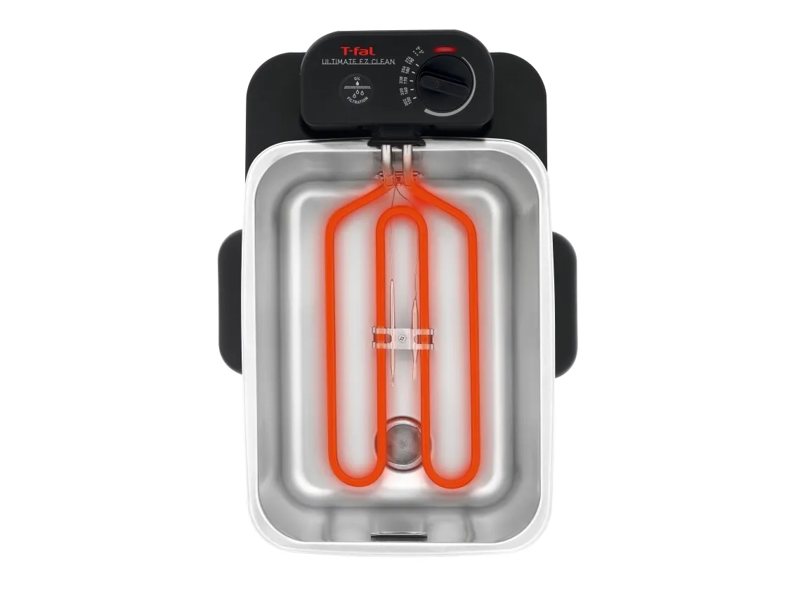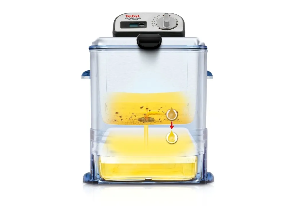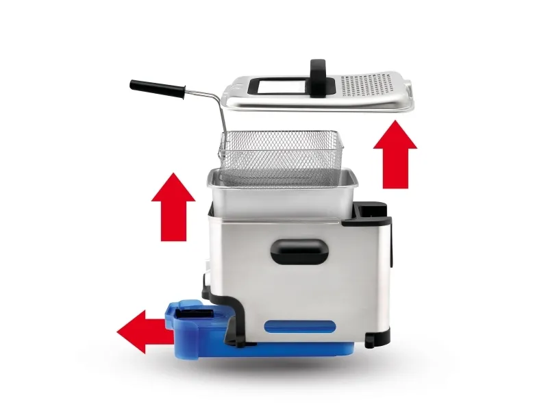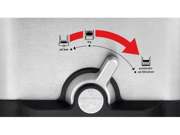 Denna fritös är unik: den filtrerar oljan helt själv! När friteringen är över stänger du bara av apparaten och vrider ratten till "automatisk filtrering". När oljan börjar kylas ned, rinner den genom en sil innan den hamnar i oljeuppsamlaren nedanför. På så sätt hålls oljan alltid ren och kan användas många gånger.