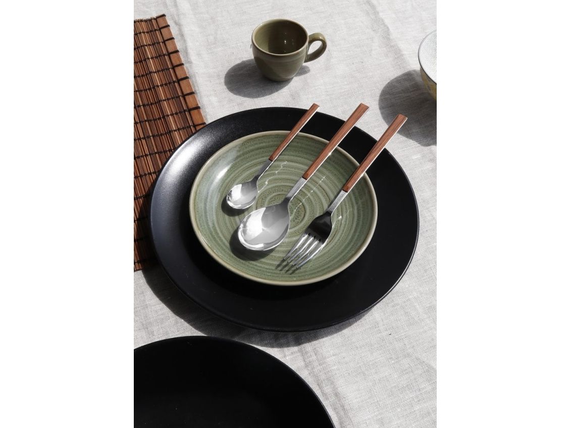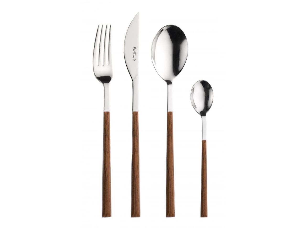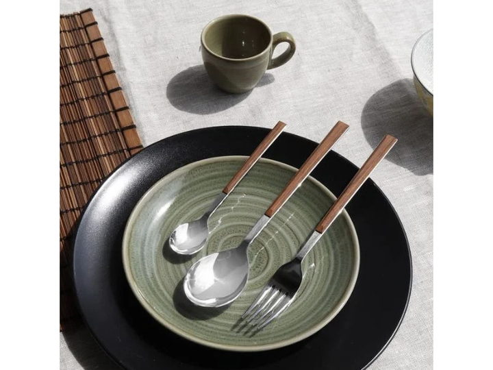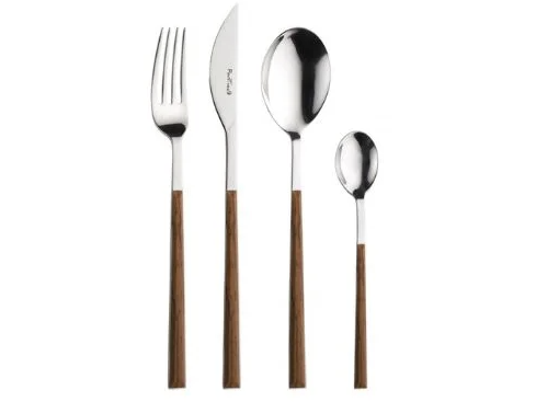 Bestikket er lavet af rustfrit stål med ABS-håndtag, hvilket sikrer både holdbarhed og en behagelig greb. De smukke træeffekthåndtag i mahogni tilføjer et strejf af elegance til hvert måltid.