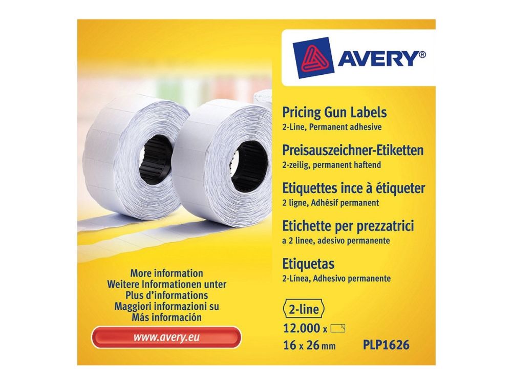 Avery PLP1626 är ett paket med vita permanenta prisetiketter som passar till Averys 2-radiga prispistol, PL2 /18. Etikettstorleken är 26 x 16 mm. Prisetiketterna har den traditionella prislappens form och har en säkerhetsperforering för att förhindra att etiketten manipuleras.