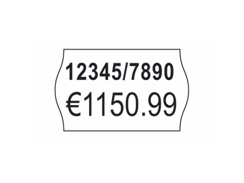 På prisetikettens övre rad finns det plats för högst 8 alfanumeriska tecken och på den nedre raden finns det plats för högst 10 alfanumeriska tecken. Förpackningen innehåller 10 rullar med 1 200 prisetiketter, totalt 12 000 etiketter.