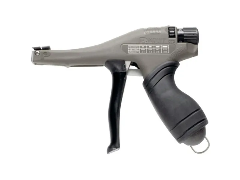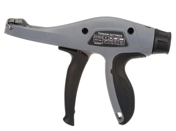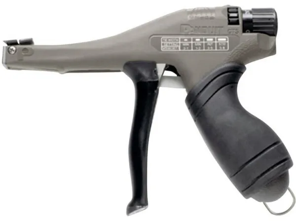 The cable tie tool in black (trigger handle, cushion sleeve, and selector knob) and gray (impact-resistant resin housing) installs subminiature, miniature, intermediate, and standard cross-section cable ties. It features adjustable tension and ergonomic design. Low handle force is required to cut off the cable tie, and an improved cable tie cut-off mechanism minimizes impact to the installer's hand. Weighing 10.4 oz. (294.5g), it is sold individually.