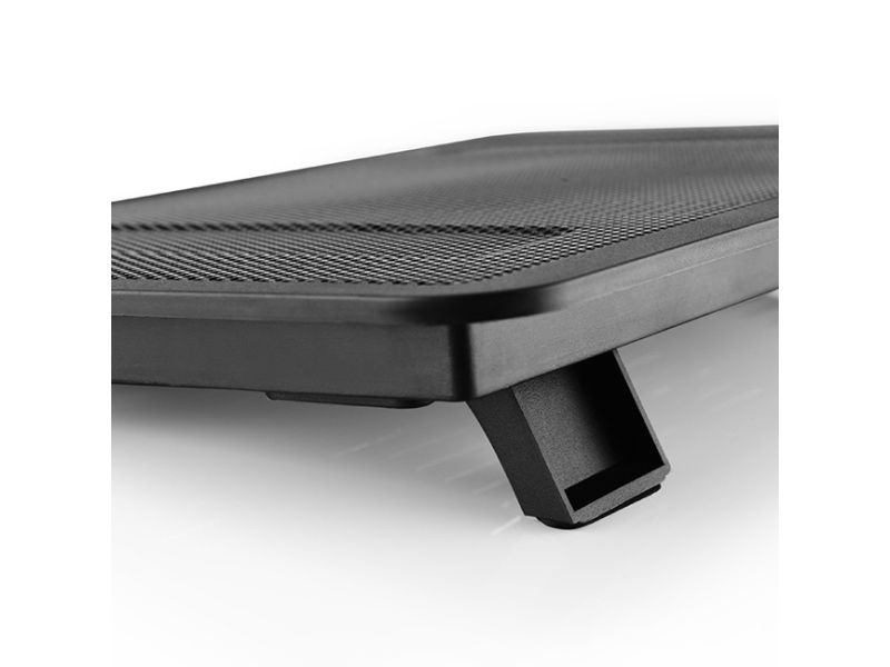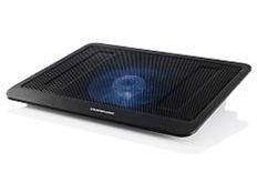 of a high quality plastic material. The upper part of the pad has been covered with a special netlike surface that provides an excellent rejection of the generated heat by the computer, thanks to the many openings in the net. There is a very silent and efficient 14cm cooling fan, backlit with blue LED’s, located directly under the cooling pad.