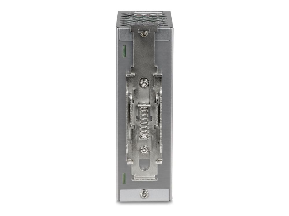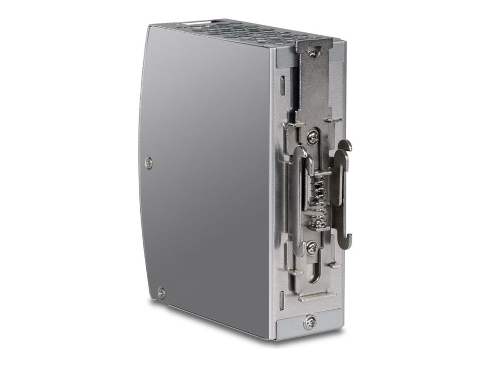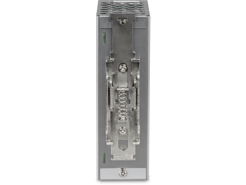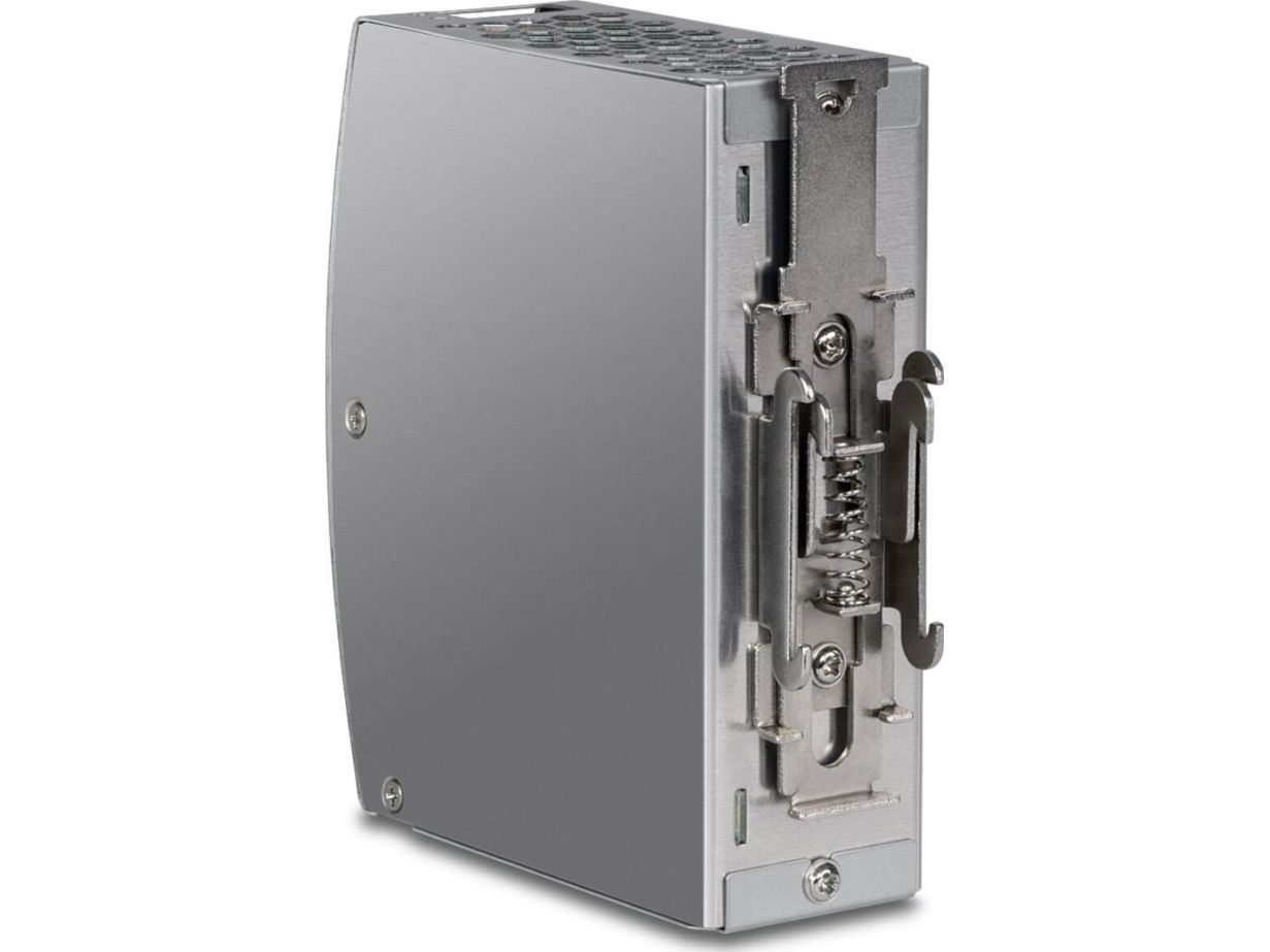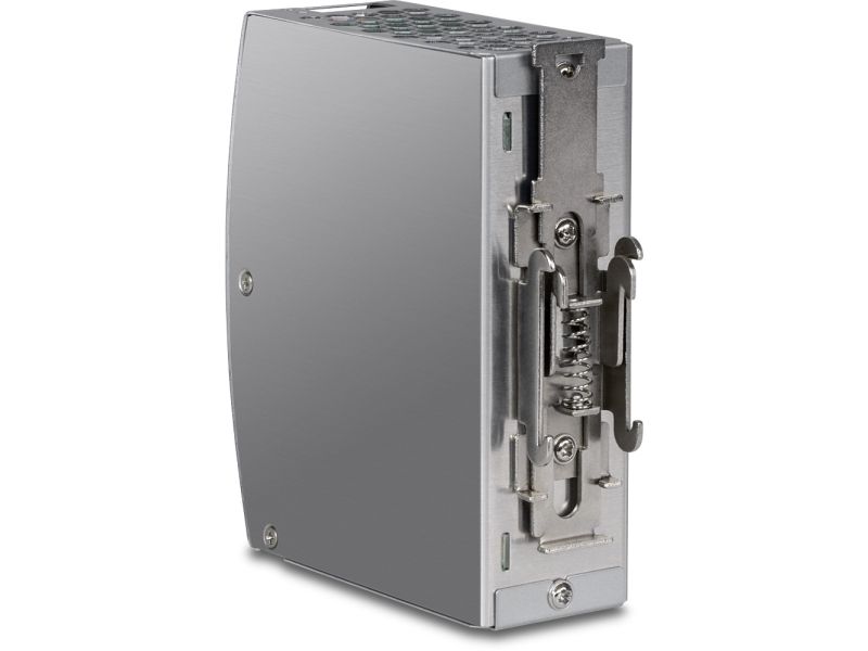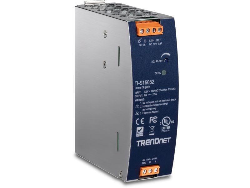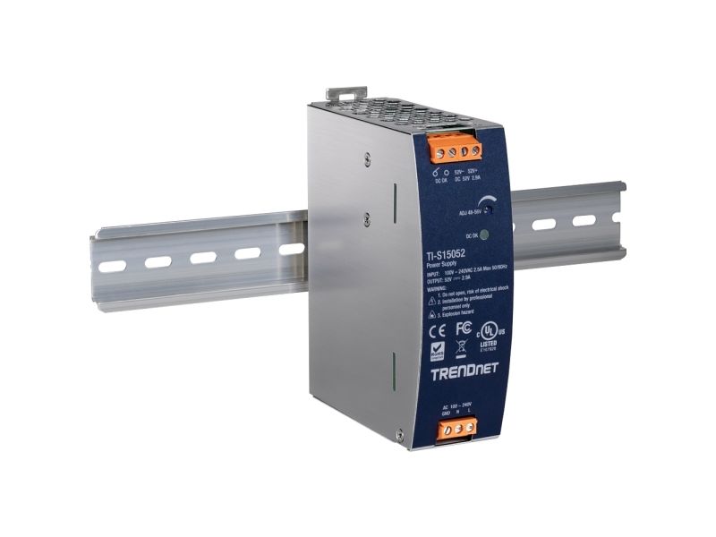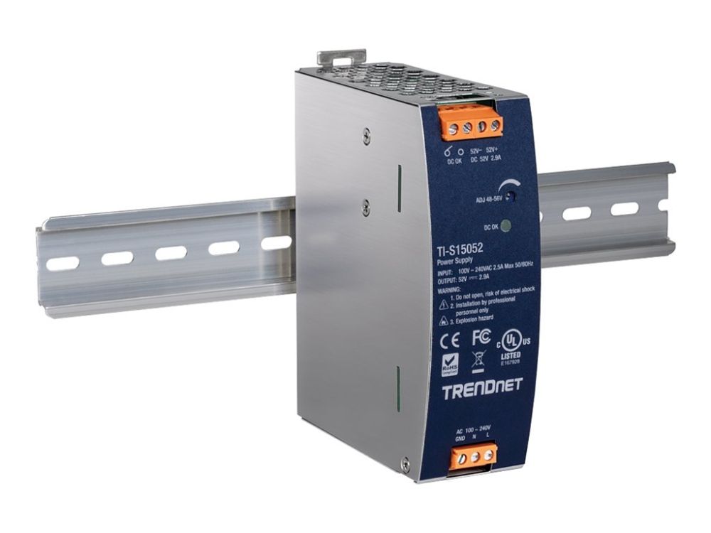 TRENDnet's AC to DC Industrial DIN-Rail Power Supply with PFC Function, model TI-S15052, supplies up to 150 W (52 V DC, 2.89 A) of power to industrial equipment, such as PoE switches, injectors, and Wi-Fi access points. This DIN-Rail power supply comes with active PFC, an integrated DIN-rail mount, overload current protection.