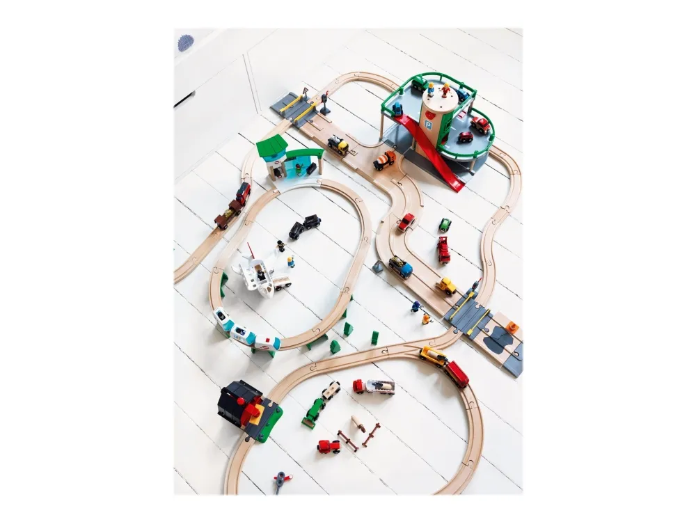 Bring the world of rail and road together in this unique parking garage with multiple levels of fun! Drive to the top and park, take the chute down, fuel up on level 1 or place the car on the ramp on level 2, press the button and see how the car falls into place on the car transporter wagon below on the railway track.