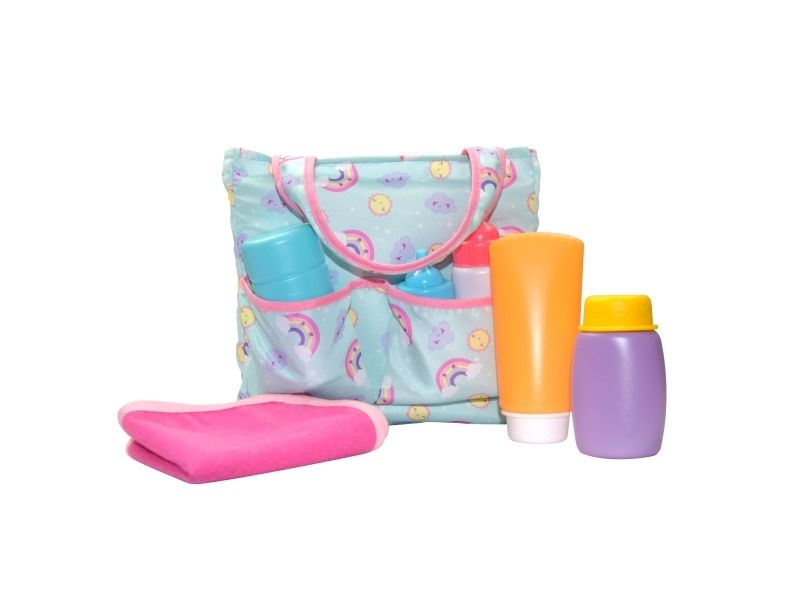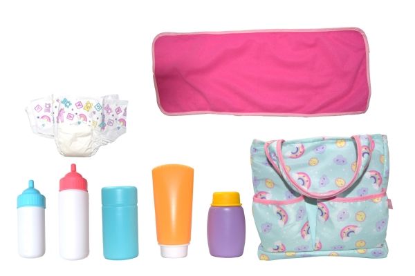 Perfekta leksakstillbehör för de små barnens rollspelslekar. Låt deras fantasi få vingar samtidigt som de tar hand om deras dockor hemma eller ute på resan. Skötväskan innehåller blöjor, filt och flaskor. Från 3 år.