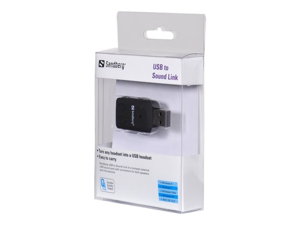 The Sandberg USB to Sound Link is a compact external USB sound card with connectors for both speakers and microphone. It allows you, for example, to connect an ordinary headset to your computer via a USB port without you having to disconnect any sound equipment already connected to the computer. This completely removes the need for complicated internal installations and gives you the freedom to move your external sound card around, for example between your desktop and laptop computers.