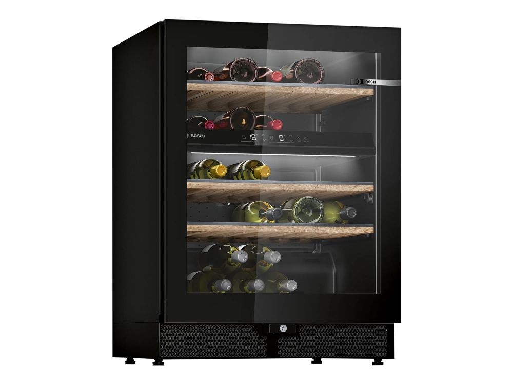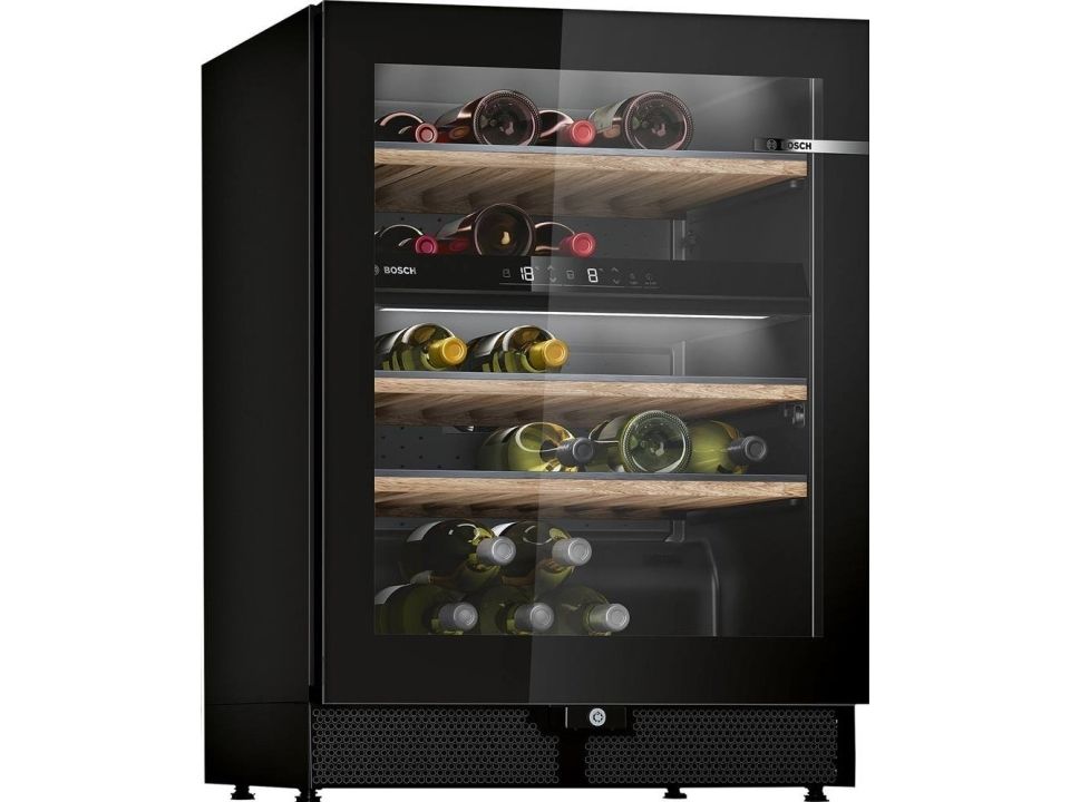 Discover the perfect blend of functionality and style with the Bosch Serie | 6 wine cooler. Designed to meet the needs of discerning wine enthusiasts, this freestanding cooler offers a generous 120-liter capacity, accommodating up to 44 bottles. Its dynamic cooling system, complemented by fan-assisted air circulation, ensures your wine collection is stored under ideal conditions, with two temperature zones that can be adjusted between 5 and 20° C. The UV filtered glass door not only provides protection against light damage but also features an elegant triple glass design that, along with the LED interior lighting, beautifully showcases your collection. Additional features such as the door open alarm, reversible door functionality, and a lockable wine cooler door enhance convenience and security. With its energy-efficient performance and quiet operation, the Bosch Serie | 6 wine cooler is an exemplary choice for preserving and displaying your wine collection.