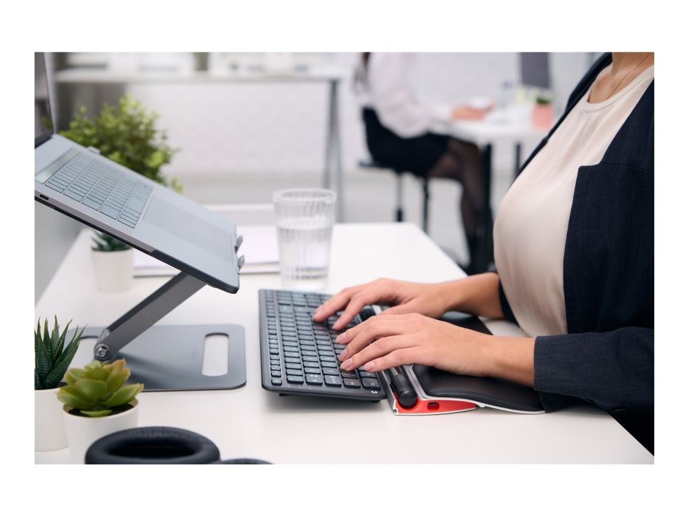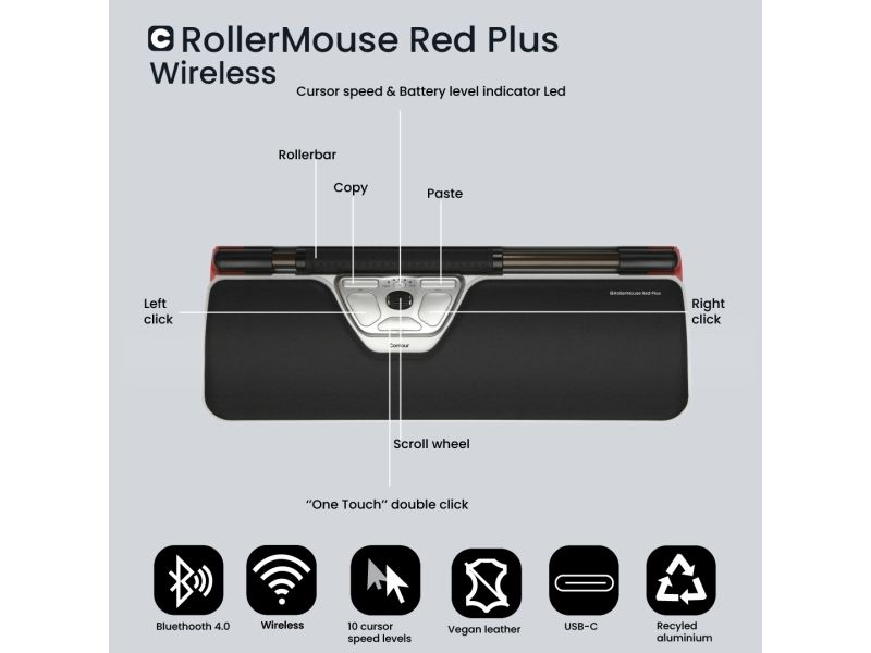 Det perfekta paret: En trådbunden ergonomisk centrerad mus och matchande tangentbord. RollerMouse Red Plus är en förstklassig ergonomisk centrerad mus i aluminium med en bred räfflad rullstång och scrollhjul för bättre kontroll. Rullstången är placerad framför din kropp, vilket säkerställer musarbete med minimal sträckning och den centrerade arbetsställningen skyddar mot rygg-, nack- och axelvärk under hela dagen. Det breda handledsstödet av veganläder och memoryskum har en antibakteriell yta med hög tålighet mot desinfektioner för optimal hygiene. Balance Keyboard har justerbara ben och lutningsfunktioner som gör det enkelt att ställa in tangentbordet i tre lägen: negativt, neutralt och positivt.