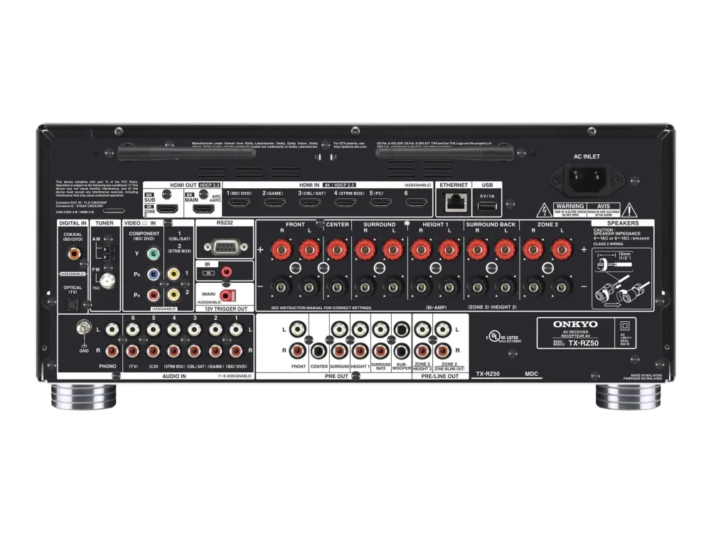 With up to 11.2 channels of processing, DIRAC Live Room Correction, and the coveted THX Certification, the Onkyo TX-RZ50 AV Receiver is a best-in-class home theater powerhouse.?The TX-RZ50 delivers enormous power on-demand to highlight every nuance of the music, movies, and games you love.