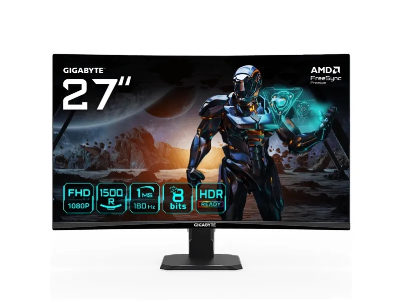 GIGABYTE GS27FC is designed to offer the most immersive viewing experience. The 1500R VA panel gives you an unprecedented gaming experience with a 180Hz refresh rate, better contrast ratio and 1ms response rate.GIGABYTE GS27FC 27" FHD Curved Gaming Monitor - 1920 x 1080, 180Hz, 1, 250 cd/m², FreeSync Premium, HDR Ready, HDMI 2.0, Displayport 1.4. Display diagonal: 68.6 cm (27"), Display resolution: 1920 x 1080 pixels, HD type: Full HD, Display technology: LED, Response time: 1 ms, Native aspect ratio: 16:10, Viewing angle, horizontal: 178°, Viewing angle, vertical: 178°. VESA mounting. Product colour: Black