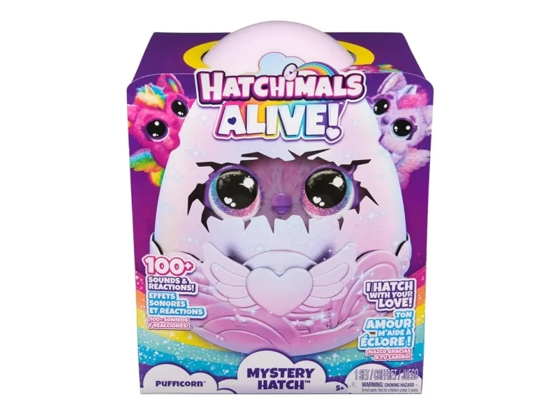 Något magiskt är på väg: Hatchimals Alive Mystery Hatch, och de behöver din kärlek för att kläckas. Med en spännande kläckningsupplevelse med dimma, ljus och över 100 ljud och reaktioner är dessa Hatchimals ett måste. Vem kommer du att kläcka? Det är en överraskning. Inuti varje Mystery Hatch Hatchimals-ägg finns 1 av 2 karaktärer. Krama, tryck, lyft och luta ägget för att uppmuntra din karaktär att kläckas - ägget kommer att lysa upp och luta och du kommer till och med att höra din Hatchimal reagera från insidan. När ditt ägg har fått tillräckligt med kärlek kan du samla familj och vänner och förbereda dig för den ultimata kläckningsupplevelsen. Magisk dimma kommer att dyka upp och ägget kommer att lysa i regnbågsfärger, vilket bygger upp spänningen. Efter kläckningen kommer din nya Mystery Hatch-vän att inspirera till fantasifulla lekar. De som älskar överraskningsleksaker, elektroniska husdjur, actionfigurer, dockor och dockhus kommer att älska Hatchimals Alive Mystery Hatch. Minnesvärda födelsedagspresenter, festpresenter eller presenter för alla tillfällen. Innehåller 4 AA-batterier. Älska din egen Hatchimal och väck den till liv med Hatchimals Alive Mystery Hatch. Från 5 år och uppåt. Batterier (4xLR6-AA) ingår.