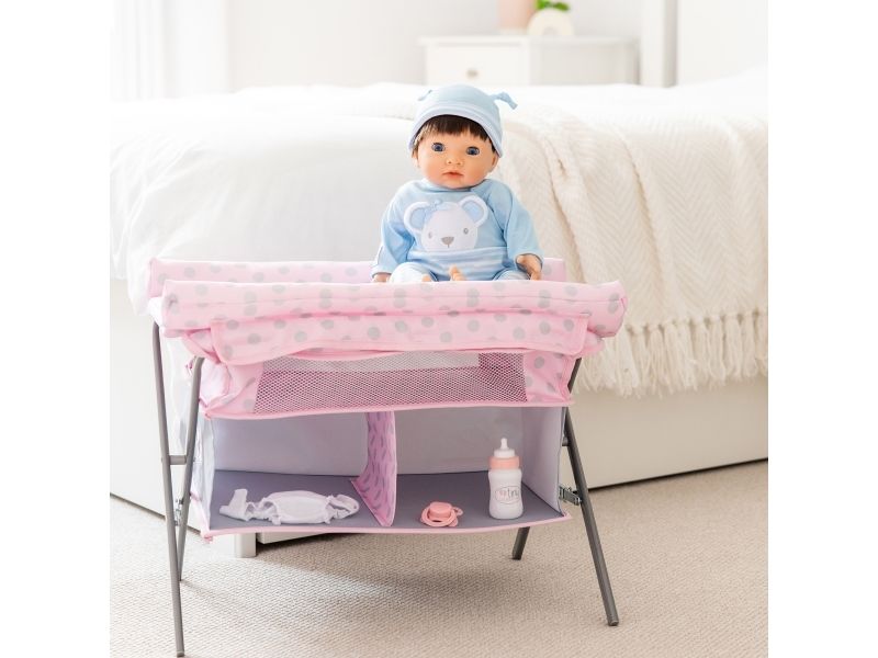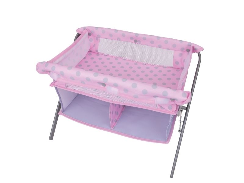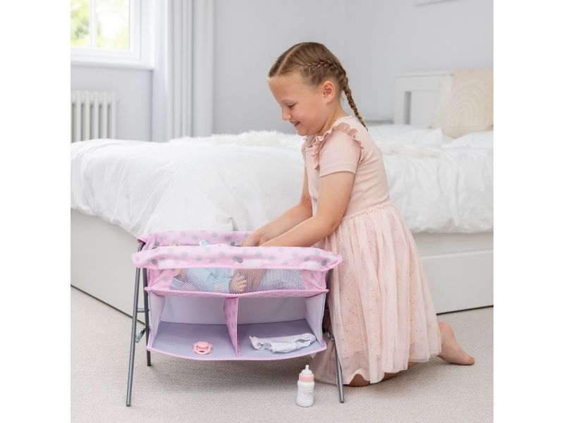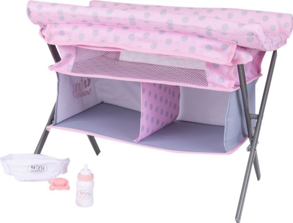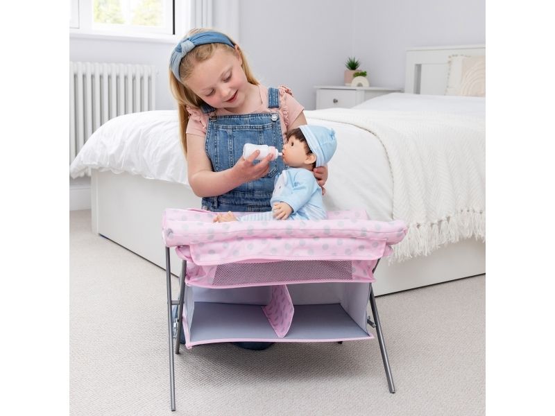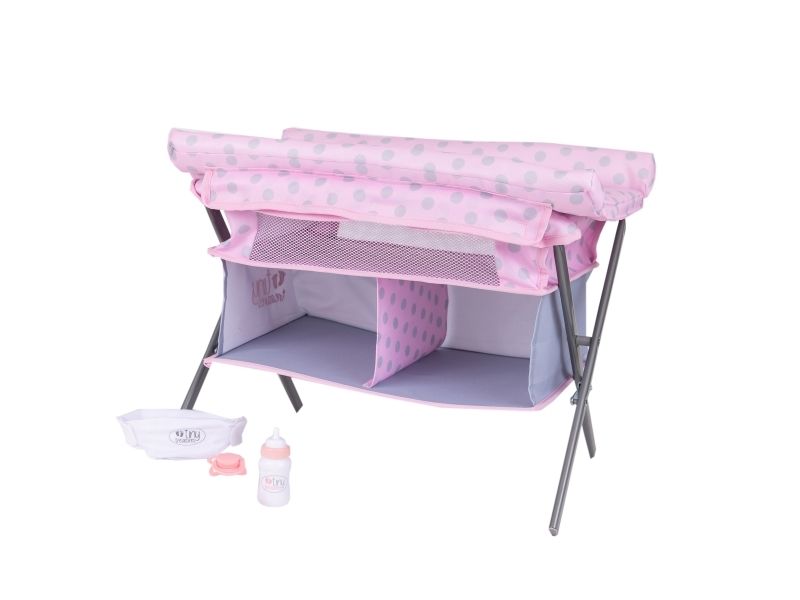Tiny Treasures fällbart skötbord och säng! En kombinerad möbel med skötmatta, säng och 2 tyghyllor. Dockmöblet inkluderar en blöja, en nappflaska och en napp. Från 3 år.
