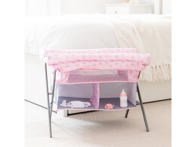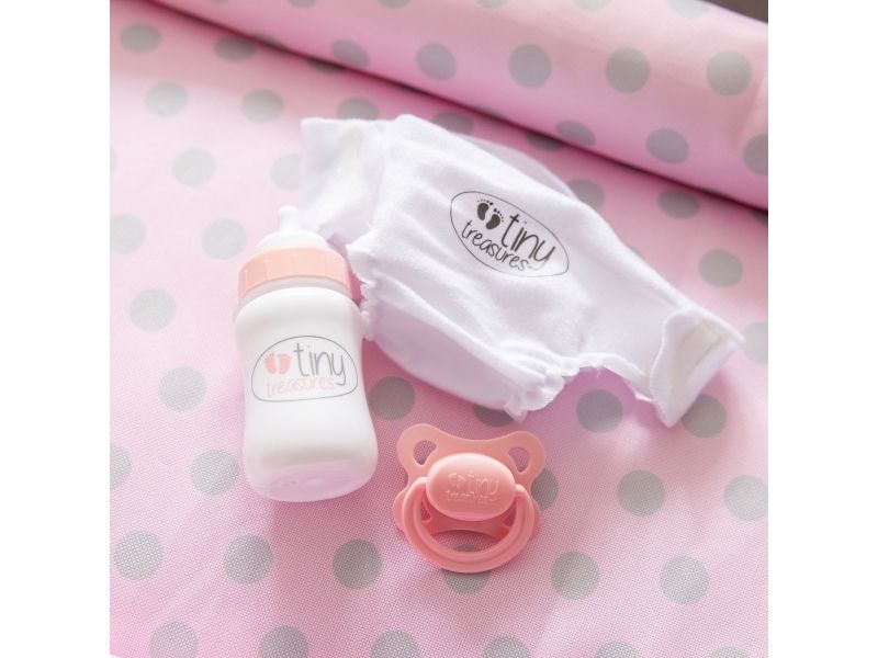 Tiny Treasures fällbara skötbord och säng ger många timmars fantasifull lek och gör det ännu roligare att ta hand om dina Tiny Treasures-babydockor. Tiny Treasures kombinerade skötmöbel kommer med en prickig skötmatta som enkelt kan tas av och på igen, vilket gör blöjbyten till en lek! När det är dags för en tupplur, ta helt enkelt bort skötmattan så att du kan lägga din babydocka för att sova i sängen. Det fällbara skötmöblet har också två tyghyllor, perfekta för att förvara alla nödvändigheter och tillbehör till din babydocka. Möblet inkluderar också det absolut mest nödvändiga för din babydocka! – en blöja, en nappflaska och en napp. Tiny Treasures fällbara skötmöbel kommer i rosa och grå färger, med söta rosa detaljer och ett prickigt mönster. Möblet har en metallram som gör det robust för lek, och för enklare förvaring och platsbesparing kan det enkelt fällas ihop genom att skjuta båda sidorna av metallsnapparna vid vikmekanismen åt sidan. Tiny Treasures Fällbart Skötbord och Säng är ett önskemöbel både för dig och din docka. Skötmöblet passar till dockor på 44 cm. Från 3 år. Funktioner: Tiny Treasures Fällbart Skötbord och Säng Skötmattan kan enkelt tas av och på Dockan kan ta en tupplur i sängen när skötmattan är borttagen Möblet har två tyghyllor för babyutrustning Inkluderar en blöja, nappflaska och napp Möblet har metallram och rosa & grått tyg Fäll möblet genom att skjuta metallsnapparna åt sidan Passar dockor på 44 cm Från 3 år Innehåll: 1 Tiny Treasures fällbart kombiskötbord och säng 1 avtagbar skötmatta 1 blöja 1 nappflaska 1 napp