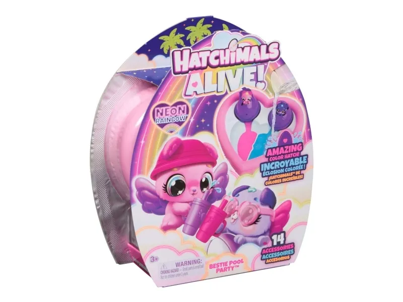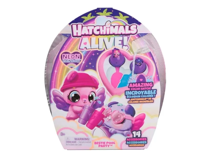 Includes: 2 Hatchimals CollEGGtibles, 1 Pool, 12 Accessories, 2 Pairs of Wings, 3 Chip Art Photos, 1 Checklist, 1 Instruction SheetHatchimals Alive, Neon Rainbow Bestie Pool Party with 2 BFF Figures in Color Reveal Eggs, 14 Accessories, Kids Toys for Ages 3 and up. Recommended age (min): 3 yr(s), Product colour: Multicolour