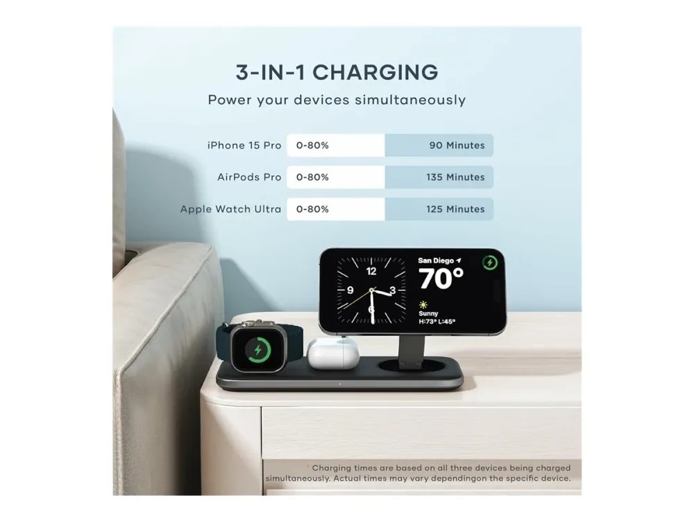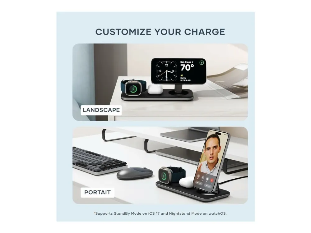 The Satechi Qi2 Trio wireless charging pad offers a versatile solution for powering multiple devices simultaneously. With a sleek design featuring vegan leather, silicone, and an aluminum enclosure, it looks stylish and is built to last. Designed for compatibility with cellular phones, smart watches, and wireless earphones, this charging pad can efficiently charge up to 3 devices at once, making it a convenient accessory for any tech-savvy individual. Additionally, the 15 W power provided ensures quick charging, while the included AC power adapter means it's ready to use right out of the box. The foldable feature adds portability, making it easy to take on-the-go.