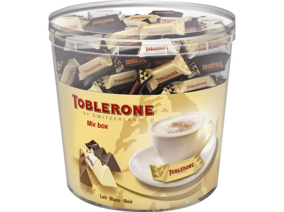 Forkæl dig selv eller del med andre! Toblerone Tiny Mix byder på en lækker blanding af mælke-, mørk- og hvid chokolade med den klassiske smag af honning og mandelnougat. Perfekt til kontoret, receptionen eller som gave.