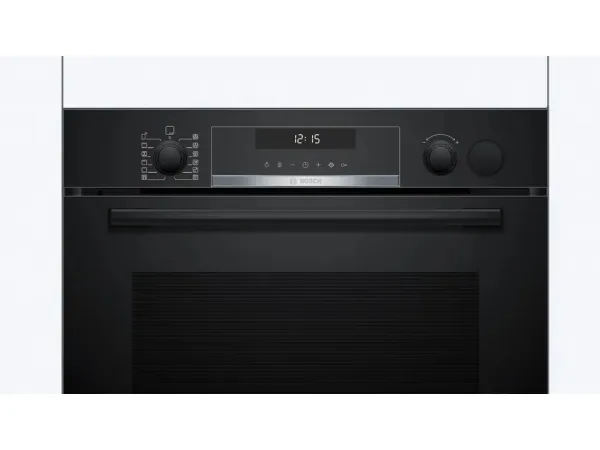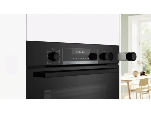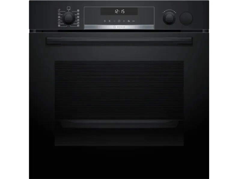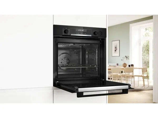 The oven integrates seamlessly with smart home technology, being Wi-Fi compatible and supporting voice control through Google Assistant and Alexa. Safety is prioritized with features like a safety switch, electronic door lock, and ChildLock, ensuring a secure cooking environment. With Energy Class A+ efficiency and a self-cleaning pyrolytic function, maintaining the Bosch Serie | 6 HRG578BB7 remains convenient while being energy-conscious.