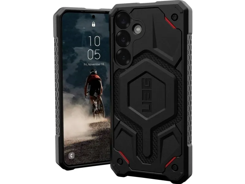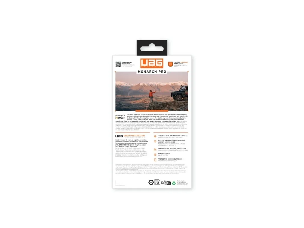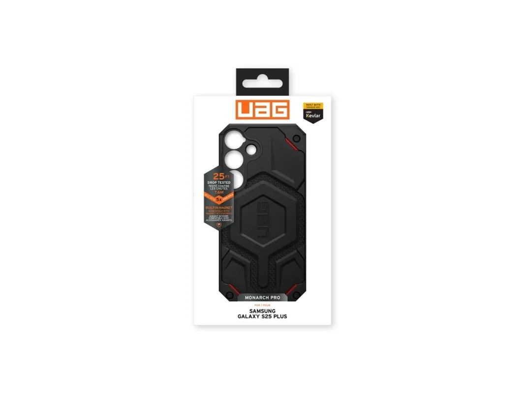 Elevate your Samsung Galaxy S25 Plus protection with the Urban Armor Gear Monarch Pro case. Featuring DuPont? Kevlar® and an integrated magnetic module this rugged case offers unparalleled durability and wireless charging compatibility. 5-layer construction for ultimate protection DuPont? Kevlar® reinforced design Built-in magnetic module for wireless charging Military-grade drop protection Premium tactile buttons and grip Unrivaled 5-Layer Protection The Monarch Pro boasts an innovative 5-layer construction including a shock-resistant core signature armor frame with Kevlar® inlay polycarbonate shear plate impact-resistant rubber surround and an integrated magnetic module. This comprehensive design ensures your device stays safe from drops scratches and daily wear. Kevlar® Reinforced for Strength and Style Featuring DuPont? Kevlar® inlay the Monarch Pro's signature armor frame not only enhances the case's strength but also provides a distinctive premium appearance. This advanced material contributes to the case's durability while maintaining a sleek and sophisticated look. Seamless Wireless Charging Compatibility The built-in magnetic module aligns perfectly with MagSafe Qi and most wireless chargers and magnetic accessories. This feature ensures faster wireless charging and maintains full compatibility with Samsung Pay allowing you to stay powered up without compromising functionality. Military-Grade Drop Protection Independently tested to withstand drops up to 25 feet (7.6 meters) the Monarch Pro exceeds military drop-test standards (MIL STD 810G 516.6) by 5 times. This exceptional level of protection gives you peace of mind knowing your device is safe from accidental drops and impacts. Enhanced Usability and Grip The Monarch Pro is designed with user experience in mind. It features oversized tactile buttons for ultra-responsive clicks a contoured perimeter edge with anti-slip traction for secure handling and integrated lanyard anchor points for added security and convenience. Package includes: 1x UAG Monarch Pro case for Samsung Galaxy S25+ Product specifications: Compatible with: Samsung Galaxy S25+ Material: DuPont? Kevlar® polycarbonate rubber Drop protection: Up to 25 feet (7.6 meters) Wireless charging: Compatible with MagSafe Qi and most wireless chargers Color: Kevlar Black *The DuPont Oval Logo DuPont? and Kevlar® are trademarks or registered trademarks of affiliates of DuPont de Nemours Inc. and used under license by Urban Armor Gear.