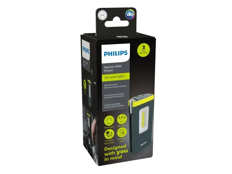 The compact, powerful Philips Xperion 6000 Pocket is perfect for confined spaces, with an ultra-flexible 100 lm, 25 cm hose spotlight. There's also a wide-beam light with 150 lm in Eco and 300 lm in Boost mode.Philips Xperion 6000 X60POCKX1 Pocket. Bulb technology: LED, Colour temperature: 6000 K, Focus luminous flux: 100 lm. Product colour: Grey, Yellow, Housing material: Acrylonitrile butadiene styrene (ABS), Rubber, International Protection (IP) code: IP65. Power source: Battery, Battery capacity: 2000 mAh, Charging time: 3.5 h. Minimum order quantity: 6 pc(s). Operating temperature (T-T): -10 - 40 °C