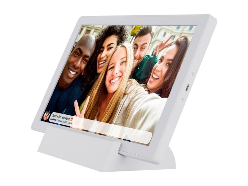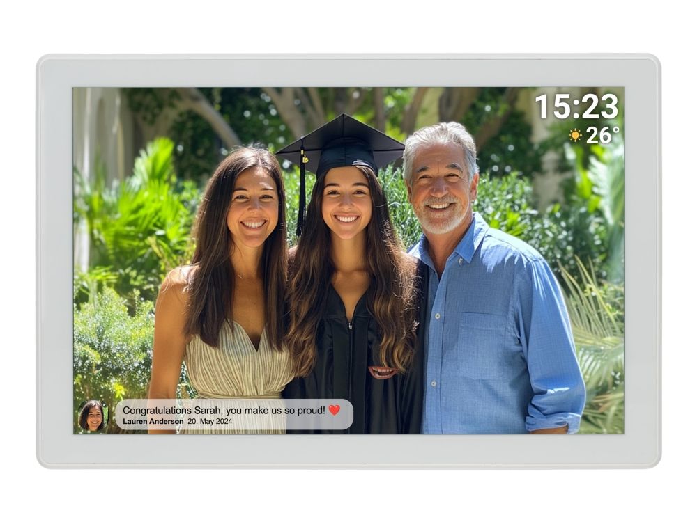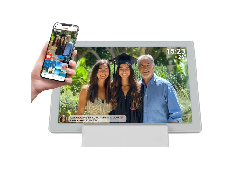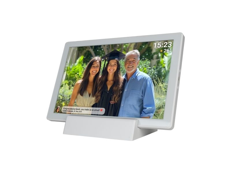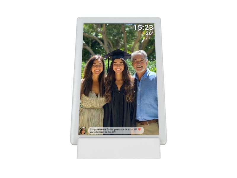 DENVER PFF-1070W är en mångsidig digital fotoram som väcker minnen till liv med en levande 10,1-tums IPS-skärm med en upplösning på 1280 x 800. Denna digitala fotovisare visar bilder och fungerar som en digital videospelare, så att användarna kan visa sina favoritvideor tillsammans med foton. Den är utrustad med en minneskortläsare och stöder microSD-kort, vilket ger flexibilitet vid visning av innehåll utan att behöva förlita sig enbart på intern lagring. Med en integrerad flashminneskapacitet på 16 GB och Wi-Fi-anslutning kan användarna överföra och uppdatera sin multimediasamling från var som helst inom räckvidden. Ytterligare funktioner som fjärrkontroll via smartphone, automatisk timerfunktion och bildrotation förbättrar användarvänligheten och gör det enkelt att anpassa visningsupplevelsen. Enheten har ett uppladdningsbart 3000 mAh-batteri för bärbarhet, vilket gör att den kan flyttas och användas på olika platser utan att vara bunden till ett eluttag. DENVER PFF-1070W kombinerar praktisk funktionalitet med stil och skapar ett idealiskt sätt att visa upp värdefulla minnen.