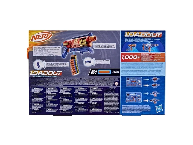 Bring video games to life and customize your ultimate blaster! Nerf Loadout dart blasters include interchangeable attachments to mix and match for more than 1000 combinations! The Nerf Loadout Shadowspeed Recon blaster includes a 14-dart storage attachment for rapid reloading that’s interchangeable with all other Loadout blasters. Fire into stealth missions with this pump action blaster that has a 6-dart revolving cylinder and features the epic Shadowspeed Recon skin. The Nerf Loadout Shadowspeed Recon blaster includes 14 Nerf N1 darts designed for extreme accuracy, speed, and distance. Build your Nerf Loadout blaster stockpile for endless customizable options (each sold separately, subject to availability). Nerf N1 darts are compatible only with Nerf N1 dart blasters. Eyewear recommended (not included).