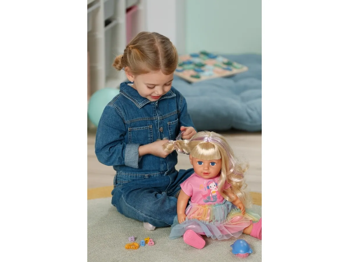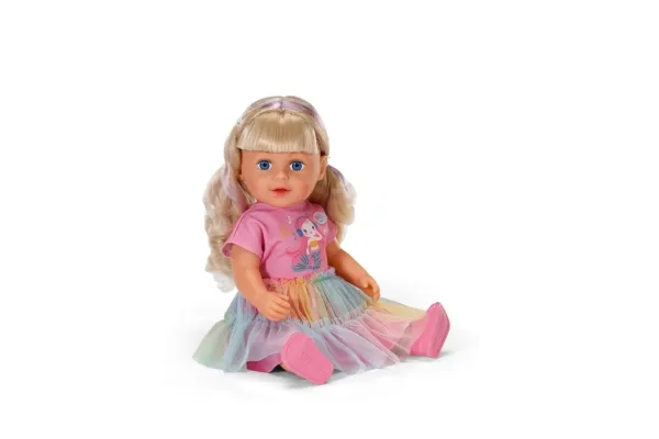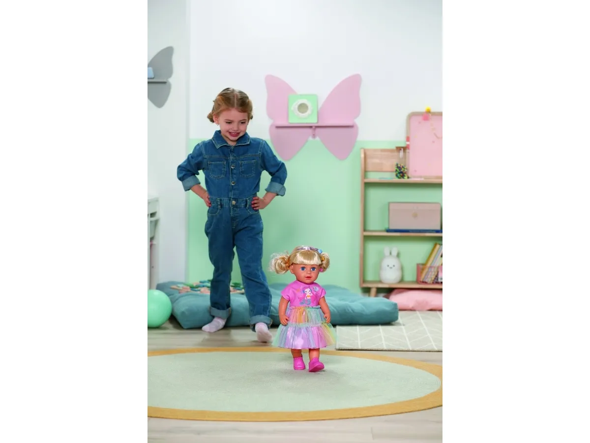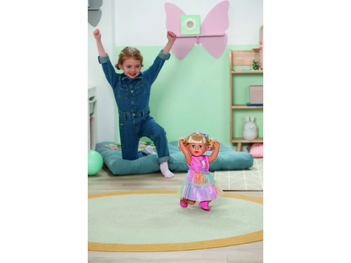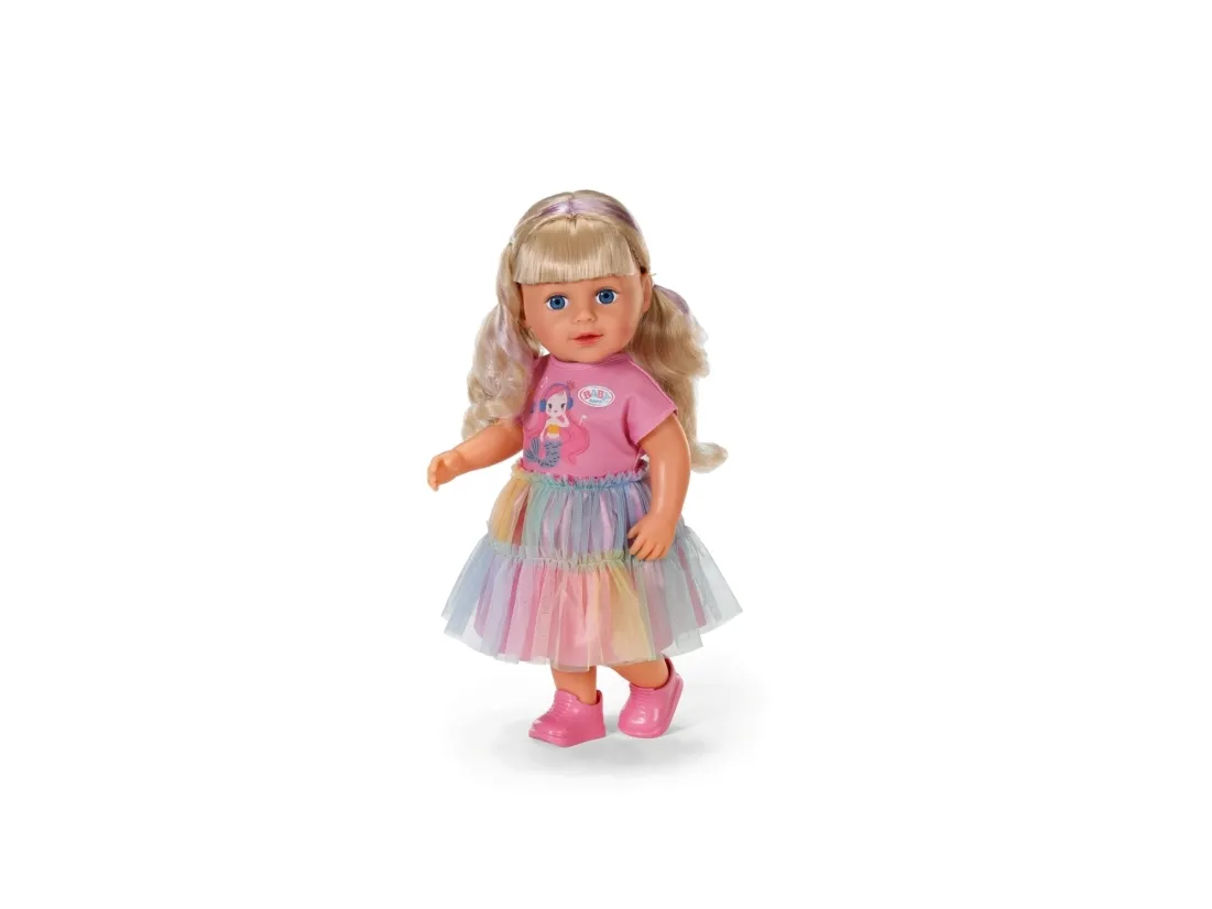 Here comes Carla! BABY born Emma's big sister from the popular animated series inspires with her great outfit with a colorful tulle skirt and lots of styling options. She has a hairbrush and various accessories for styling with her. But that's not all: Carla loves exercise. As in the series, she can pull off the coolest dance moves: her movable head and arms as well as the movable knees provide versatile movements. Thanks to her firm body, she can even stand on her own. But that's not all: It can also be taken into the bathtub and worn all outfits from BABY born in size 43cm.BABY born Carla 43cm. Doll type: Baby doll, Doll's gender: Female, Recommended age (min): 4 yr(s), Suggested gender: Boy/Girl. Height: 430 mm. Material: Fabric, Plastic, Product colour: Multicolour