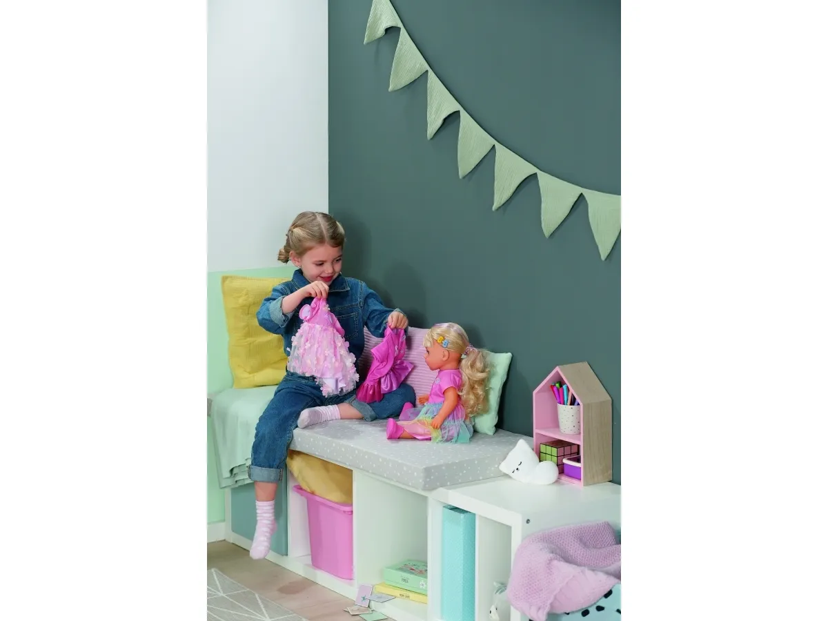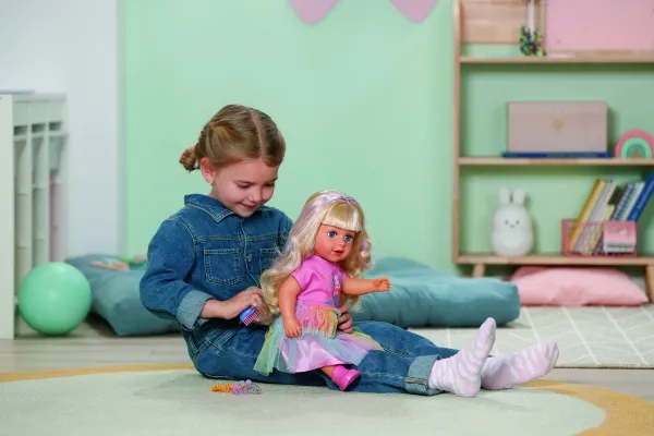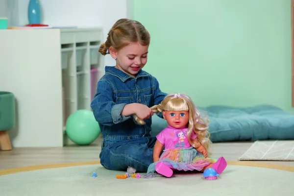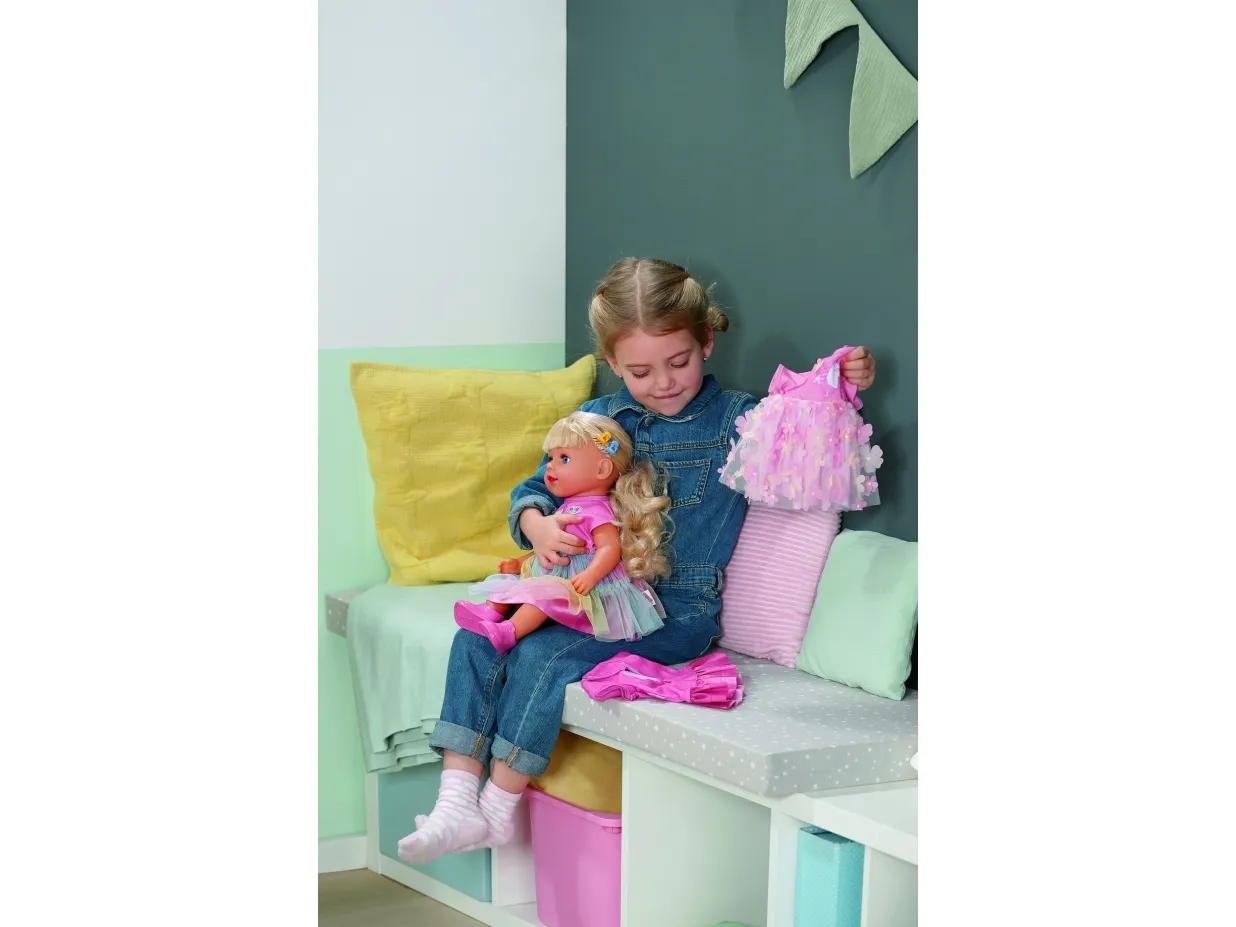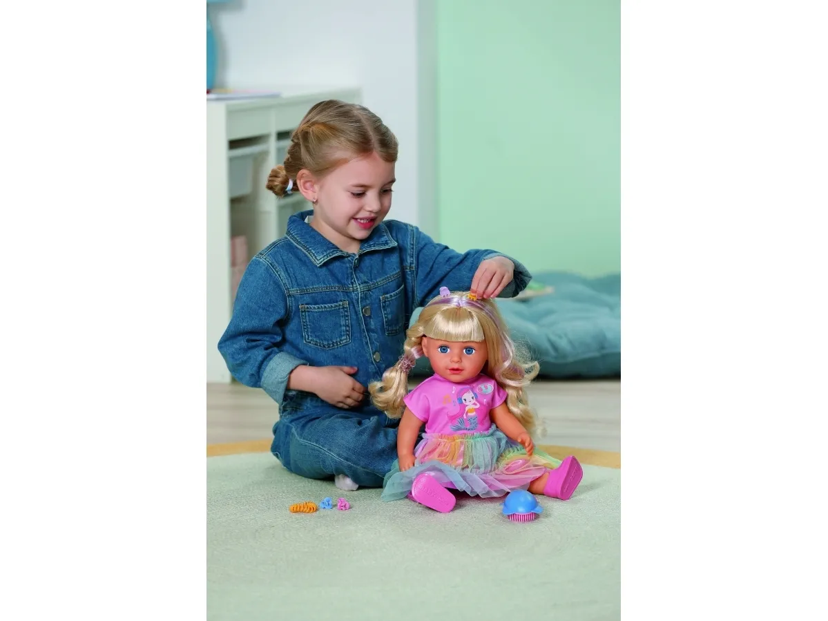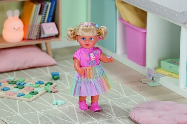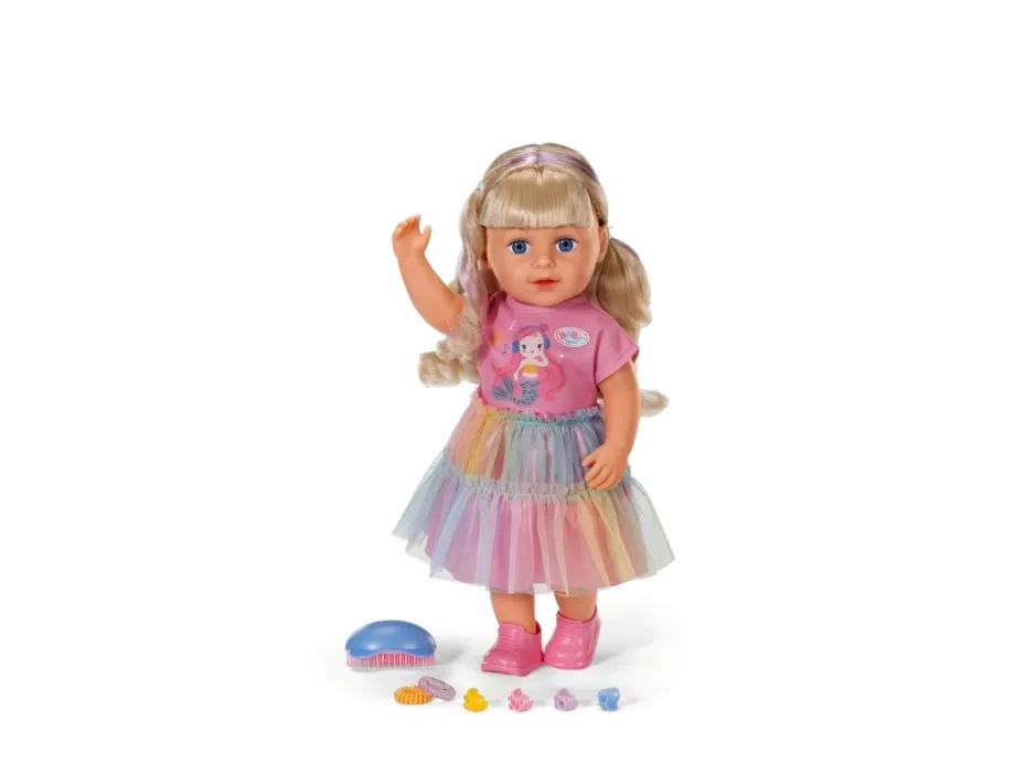 Here comes Carla! BABY born Emma's big sister from the popular animated series inspires with her great outfit with a colorful tulle skirt and lots of styling options. She has a hairbrush and various accessories for styling with her. But that's not all: Carla loves exercise. As in the series, she can pull off the coolest dance moves: her movable head and arms as well as the movable knees provide versatile movements. Thanks to her firm body, she can even stand on her own. But that's not all: It can also be taken into the bathtub and worn all outfits from BABY born in size 43cm.BABY born Carla 43cm. Doll type: Baby doll, Doll's gender: Female, Recommended age (min): 4 yr(s), Suggested gender: Boy/Girl. Height: 430 mm. Material: Fabric, Plastic, Product colour: Multicolour