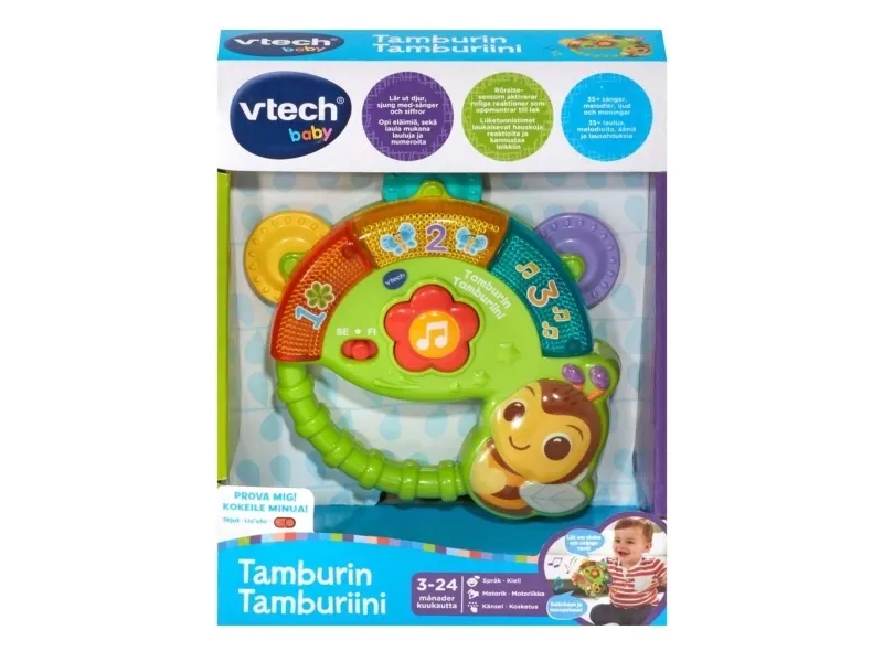 Bebisen kommer att ha roligt med att spela musik med VTech Twinkle & Learn Tambourine. Denna pedagogiska leksak har en särskild ankvän, klara färger, band och siffror. Ditt barn kan ha roligt med att lyssna på tamburinen och glada ljud medan det tittar på de blinkande ljusen.