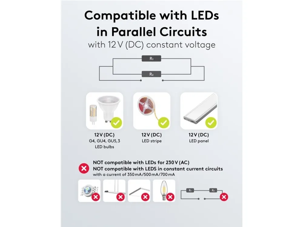 Robust LED-transformator utan minimibelastning för anslutning av ljuskällor som G4- eller GU 5.3 LED-spots, LED-strips och LED-moduler till 220-240 V (AC)-nätet