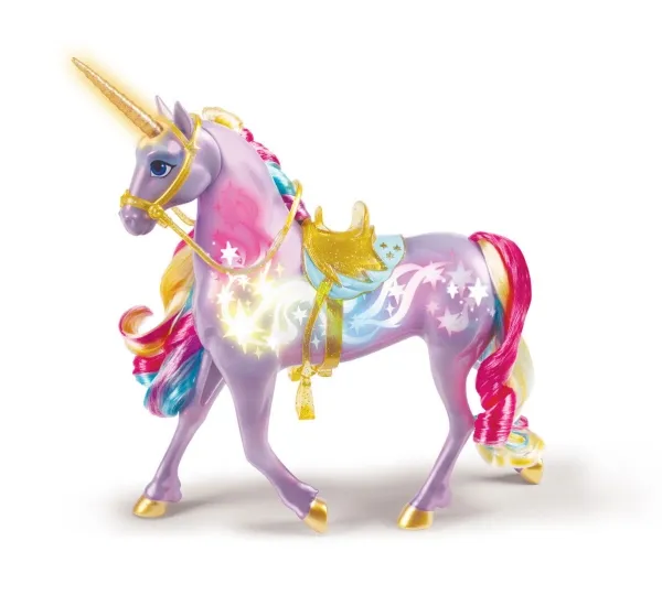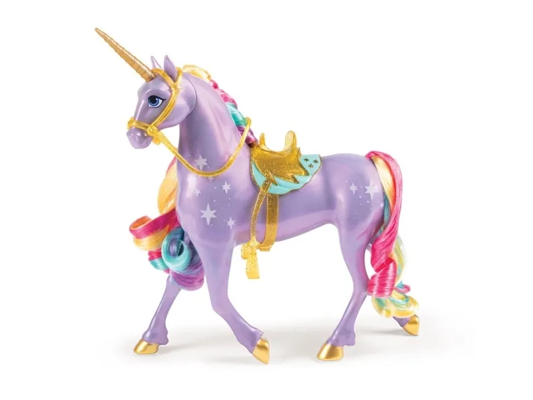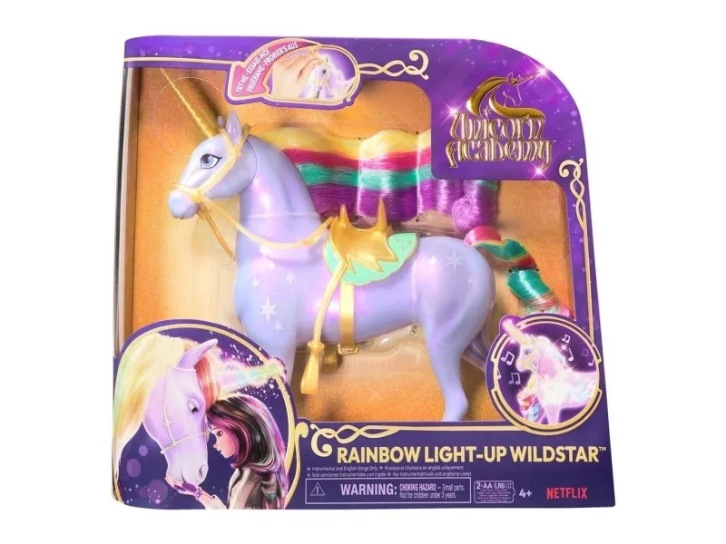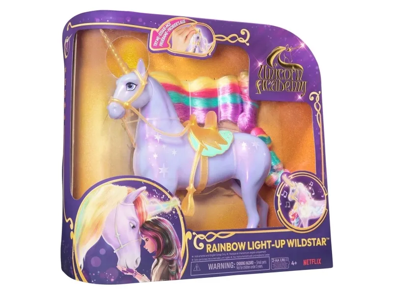 Upptäck ditt öde med Unicorn Academys Rainbow Light-up Wildstar. Den interaktiva enhörningen återskapar de magiska ögonblicken från serien med regnbågsljus, ljudeffekter och sånger (på engelska, franska och spanska). 2 st. AA-batterier krävs. Wildstar har sina vackra ljusmagimärken och sin regnbågsfärgade man och svans så att barnen kan återskapa det magiska bandet från serien. Gnugga Wildstars ansikte, rör vid hennes horn och dra i tyglarna för att se hur hon reagerar. Allteftersom bandet mellan er stärks lyser Wildstars vita ljus starkare och skiftar sedan till regnbågsfärger när du har vunnit hennes tillit. Håll hennes ansikte så fullbordas anknytningen och du får höra Wildstar fira ert magiska band med titelmusiken från serien. Fortsätt att hålla i Wildstars ansikte för att spela musiken igen eller rör vid hennes horn för mer magiskt ljus och ännu mer lek. Figurerna från Unicorn Academy får liv inspirerade av den animerade NETFLIX-serien och de bästsäljande böckerna där vänskapen regerar. Utvidga din värld med modedockor, enhörningar eller de små dockorna och lekseten från Unicorn Academy (säljs separat). Unicorn Academy-leksakerna är den perfekta presenten för alla tillfällen till barn som älskar enhörningar, hästleksaker, dockor och tillbehör, dockskåp, samlarobjekt, gosedjur och liknande. Återskapa magin från Unicorn Academy där hemma med Rainbow Light-up Wildstar.