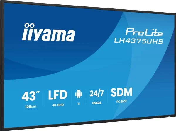 The iiyama ProLite LH4375UHS-B2AG is a versatile 43-inch LED-backlit LCD flat panel display designed for continuous operation, making it a suitable choice for digital signage applications. With a 4K UHD (3840 x 2160) resolution, this display delivers bright and vibrant images, with a brightness of 500 cd/m² and a contrast ratio of 1200:1. Its IPS technology ensures wide viewing angles of 178 degrees, allowing content to be seen clearly from different perspectives. Equipped with a built-in media player and multiple connectivity options including HDMI, USB 2.0, and LAN, this display simplifies content management and distribution. Engineered for reliability, the ProLite is designed for 24/7 operation with features like daisy chaining for multi-screen setups and anti-image retention technology to protect against static images. With an operational power consumption of 101 W and a standby power draw of just 0.5 W, it is energy-efficient. Additional features like the Smart Display Module (SDM) slot and compatibility with various content management systems make it a versatile solution to enhance any commercial space, whether in portrait or landscape mode. The sleek metal frame and thin bezel design provide a modern aesthetic, seamlessly integrating into any environment.