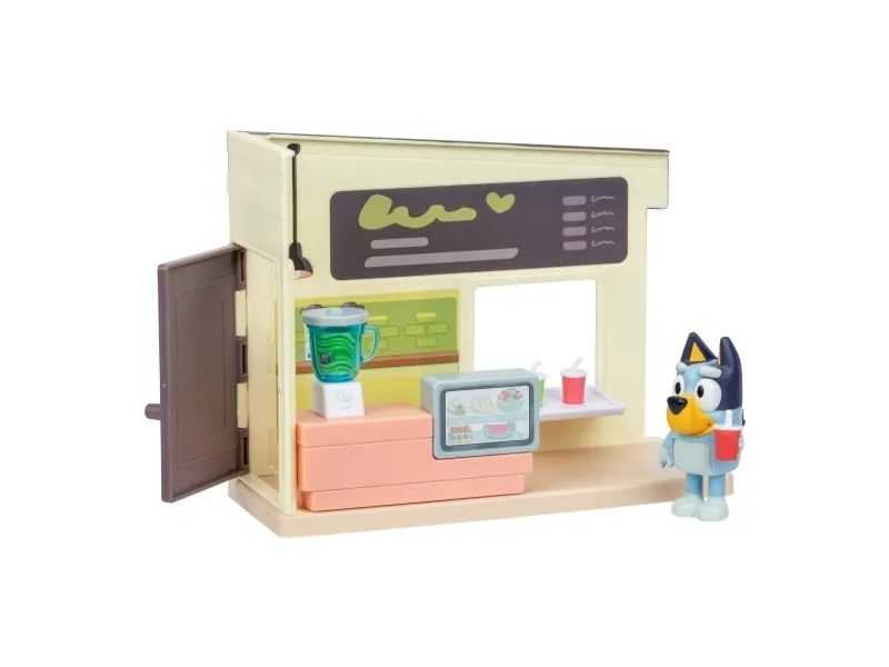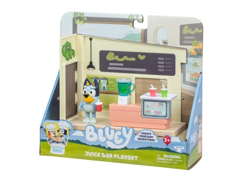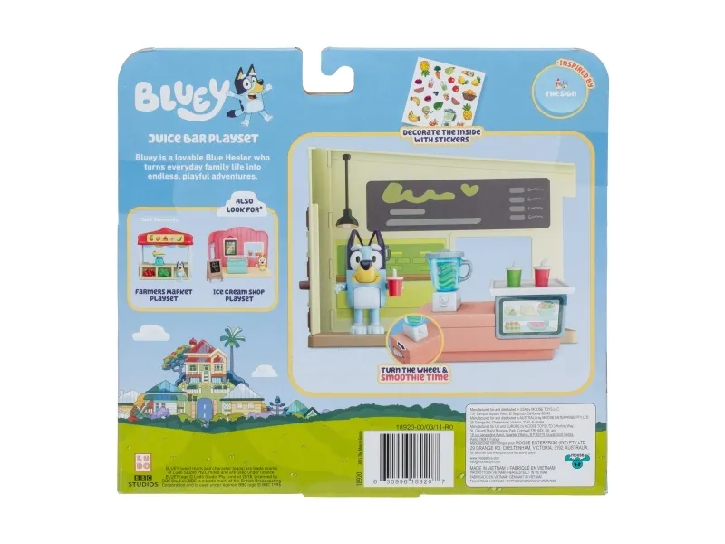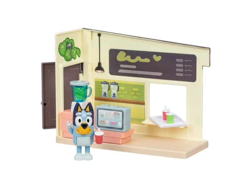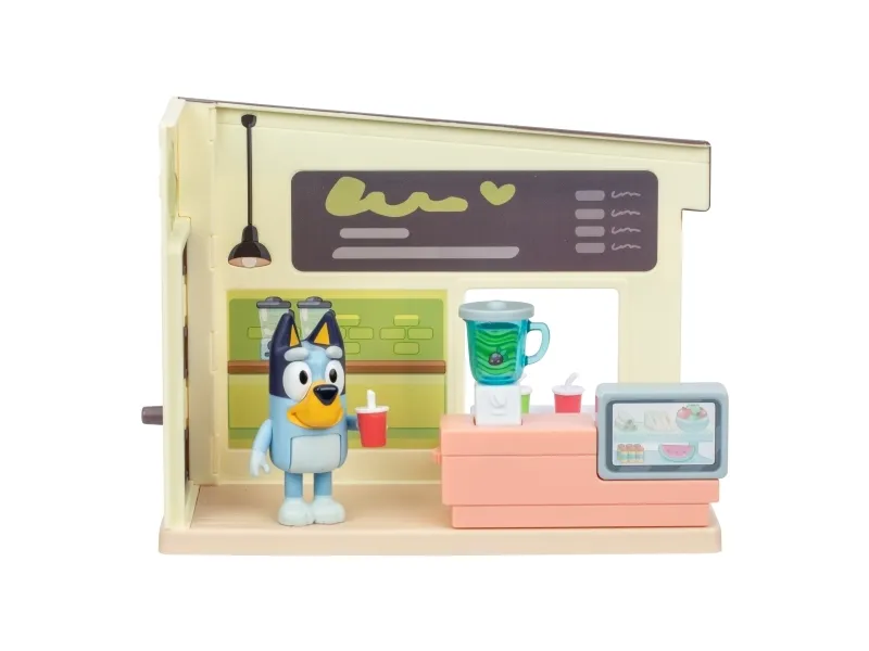 Hjälp Bluey att blanda juicer och smoothies genom att vrida på hjulet på mixern i juicebaren. Servera kunderna med drycker på brickor vid det medföljande bordet och stolarna.