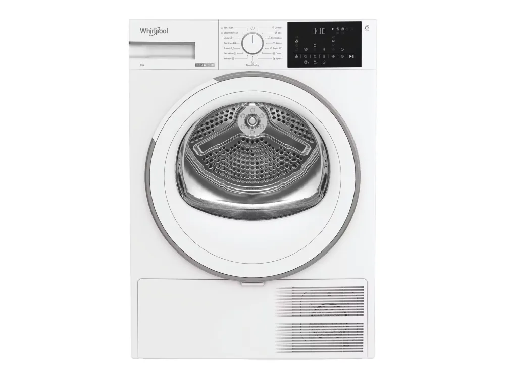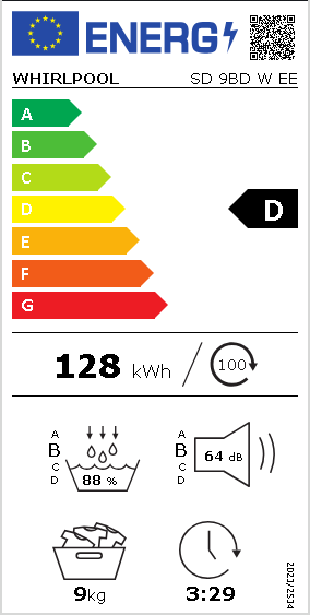 The Whirlpool SD 9BD W EE electric dryer features a spacious 9 kg capacity, ideal for handling large loads efficiently. Equipped with a heat pump drying system, this dryer helps save energy while providing optimal drying results. Users can choose from multiple drying programs including cottons, synthetics, sportswear, and specialized options like duvet and bedding to meet various fabric needs. With its advanced features, the dryer includes a moisture sensor for precise drying, an easy-to-use digital display, and a drum light for visibility during loading and unloading. Safety is prioritized with child security features, while an adjustable feet design ensures stability in various environments. This dryer also complies with relevant EU energy directives, making it a responsible choice for homes.
