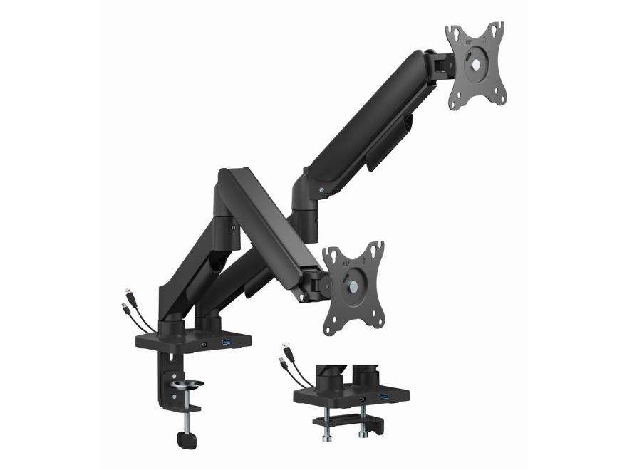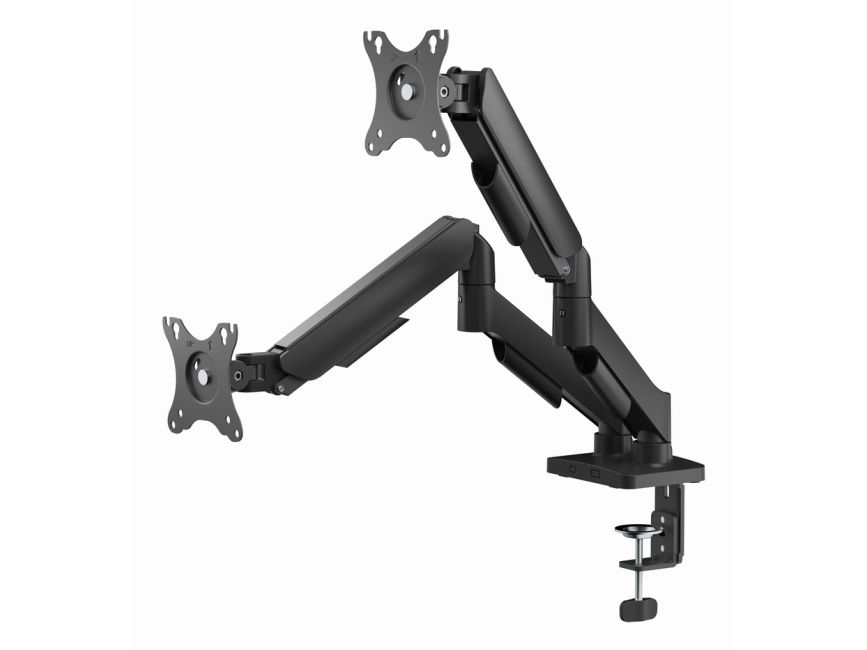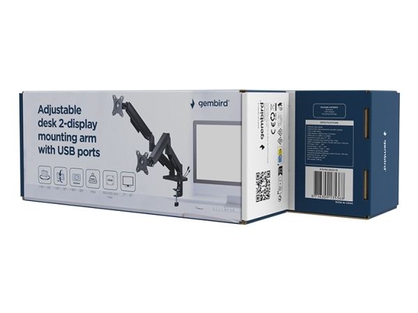 Gembirds monteringssats har en justerbar arm som ger flexibilitet vid placering av två platta skärmar i storlekarna 17 till 32 tum. Tack vare de inbyggda USB-A- och USB-C-portarna erbjuder denna monteringslösning enkel åtkomst till laddning och anslutningsmöjligheter. Konstruktionen inkluderar ett integrerat kabelhanteringssystem som håller din arbetsplats organiserad och fri från kabeltrassel. De robusta stål- och plastmaterialen som används i konstruktionen garanterar hållbarhet, medan den pulverlackerade ytan förbättrar det estetiska intrycket. Justera skärmens lutning, rotation och svängning från -90° till 90° och -180° till 180°, vilket garanterar komfort och optimala betraktningsvinklar. Installationen är enkel med alternativ för skrivbordsklämma eller genomföringsfäste som ingår i paketet.