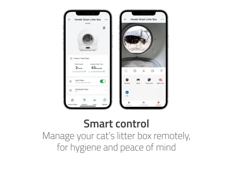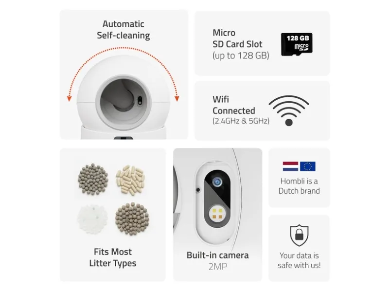 Upptäck en ny era inom kattvård med Hombli Smart Kattlåda med kamera. Denna smarta kattlåda kombinerar en elegant design med bekvämligheten av automatisk rengöring. Intelligenta rörelse- och viktsensorer säkerställer automatisk avfallsseparering, så att du aldrig behöver skopa igen. En inbyggd 1080p-kamera med mörkerseende håller dig uppkopplad med din katt i realtid. Den viskande tysta driften under 45 dBA och den minimalistiska designen gör kattlådan lämplig för alla typer av hem. Tack vare dual-band WiFi och den intuitiva Hombli-appen har du alltid full kontroll – när som helst och var som helst.