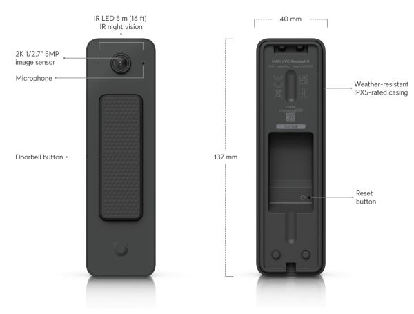 Ubiquiti UniFi Doorbell Lite är utformad för att förbättra säkerheten i hemmet med sina integrerade kamera-, högtalar- och summerfunktioner. Denna dörrklocka har en väderbeständig design som garanterar tillförlitlig prestanda i olika miljöförhållanden, med driftstemperaturer från -30 °C till 50 °C och luftfuktighet från 20 till 90 %. Med Power over Ethernet (PoE)-funktioner förenklar enheten installationen genom att eliminera behovet av separata strömkällor, medan dess tvåvägskommunikation möjliggör interaktiv kommunikation med besökare. Doorbell Lite har en 5-megapixelkamera med infraröd mörkerseende, skärpningskontroll och digital brusreducering, vilket ger högkvalitativa videobilder dag som natt och trygghet för husägare. Konstruktionen av metall och polykarbonatmaterial bidrar till enhetens tillförlitlighet och långa livslängd, vilket gör den till ett utmärkt tillskott till alla smarta hemsystem.