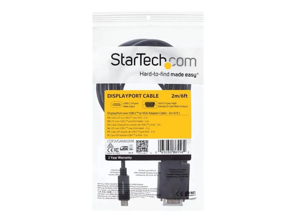 Denna USB-C till VGA-kabel gör att du kan ansluta din Thunderbolt 3- eller USB Type-C-kompatibla enhet till din bildskärm med bara en kabel, vilket gör den till en bekväm och trasselfri lösning. Enastående bildkvalitet USB-C till VGA-kabeladaptern gör att du kan utnyttja den inbyggda videokapaciteten i din dators USB-C-anslutning för att leverera fantastiska upplösningar på upp till 1920 x 1200. Dessutom är adaptern bakåtkompatibel med skärmar på 1080p och är därför ett perfekt tillbehör för hemmet, kontoret eller andra arbetsmiljöer. Trasselfri installation Med sin längd på 2 m levererar denna bildskärmskabel en kompakt anslutning som eliminerar onödiga adaptrar och kablar, vilket garanterar en städad och professionell installation. För kortare eller längre installationer erbjuder vi även en 1 m (CDP2VGAMM1MB) och en 3 m (CDP2VGA3MBNL) USB-C till VGA-kabel, så att du kan välja rätt kabellängd för dina anpassade installationsbehov. Problemfri anslutning Den reversibla USB-C-kontakten ger en enkel och bekväm anslutning. Enkel hantering och installation säkerställs genom att denna USB-C till VGA-kabel kan användas med både Windows- och Mac-datorer och att den stöder plug-and-play-installation.