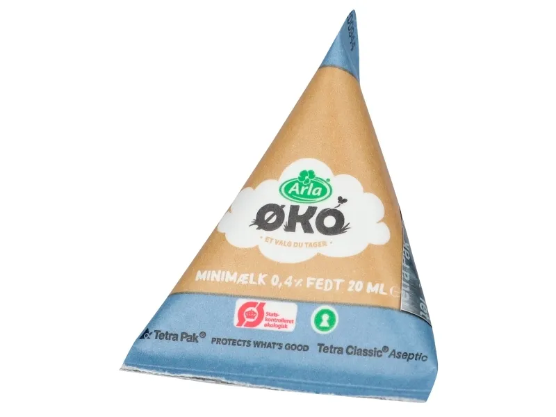 Arla økologisk minimælk har et fedtindhold på kun 0,4%. Mælken er pakket i små praktiske trekantede brikker (jigger) med 20 ml pr. stk. Brikkerne passer perfekt til en kop kaffe.