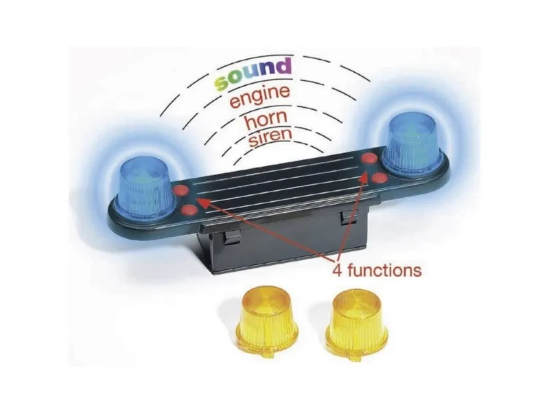 - four different functions; horn, engine noise, flashing light and siren sound, each triggered by pressing the pushbutton