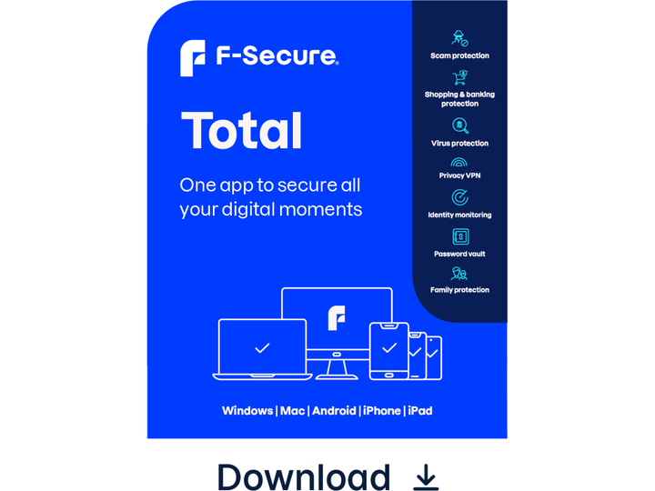 To do banking, shopping and social activities online, people are sharing more and more of their personal lives on the Internet. This means people now need to protect not just their devices, but personal information as well. F-Secure Total combines the security of safe and the easy-to-use privacy app Freedome VPN into one subscription. This gives you complete security and privacy on all your devices.