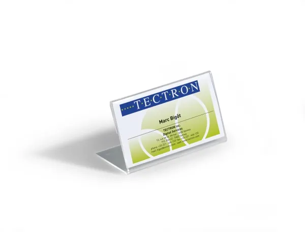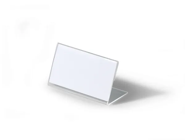 Stadig bordsskylt i L-formad design. Passar för konferenser och receptionsdiskar men även för produktbeskrivningar i t ex skyltfönster. Levereras med vita insticksetiketter. Mått: 52x100mm (HxB) Insticksetiketter på A4-ark för utskrift i skrivare kan beställas separat (art nr 1458). Använd DURAPRINT online som hjälper dig att skriva ut personligt designade insticksark.