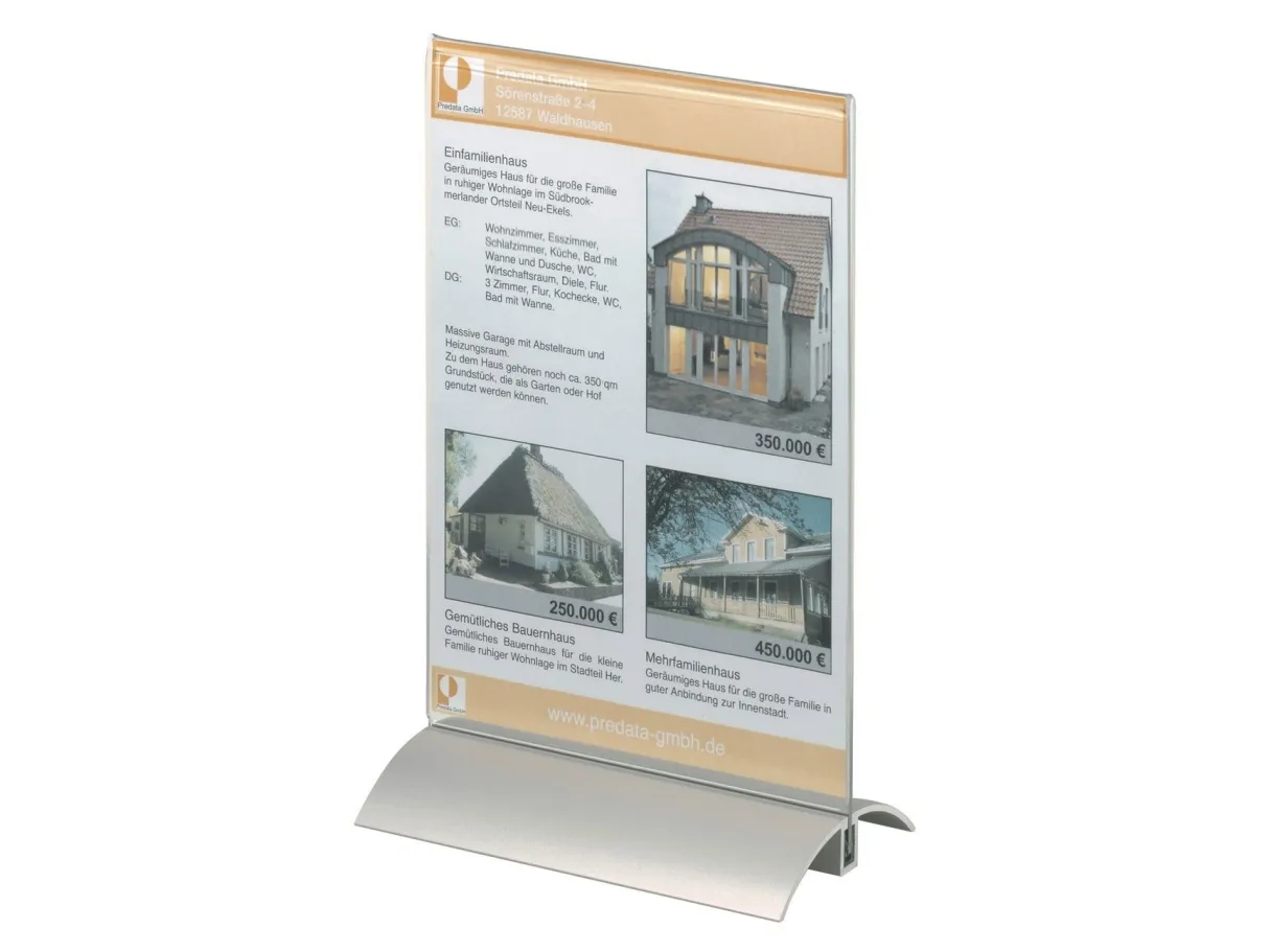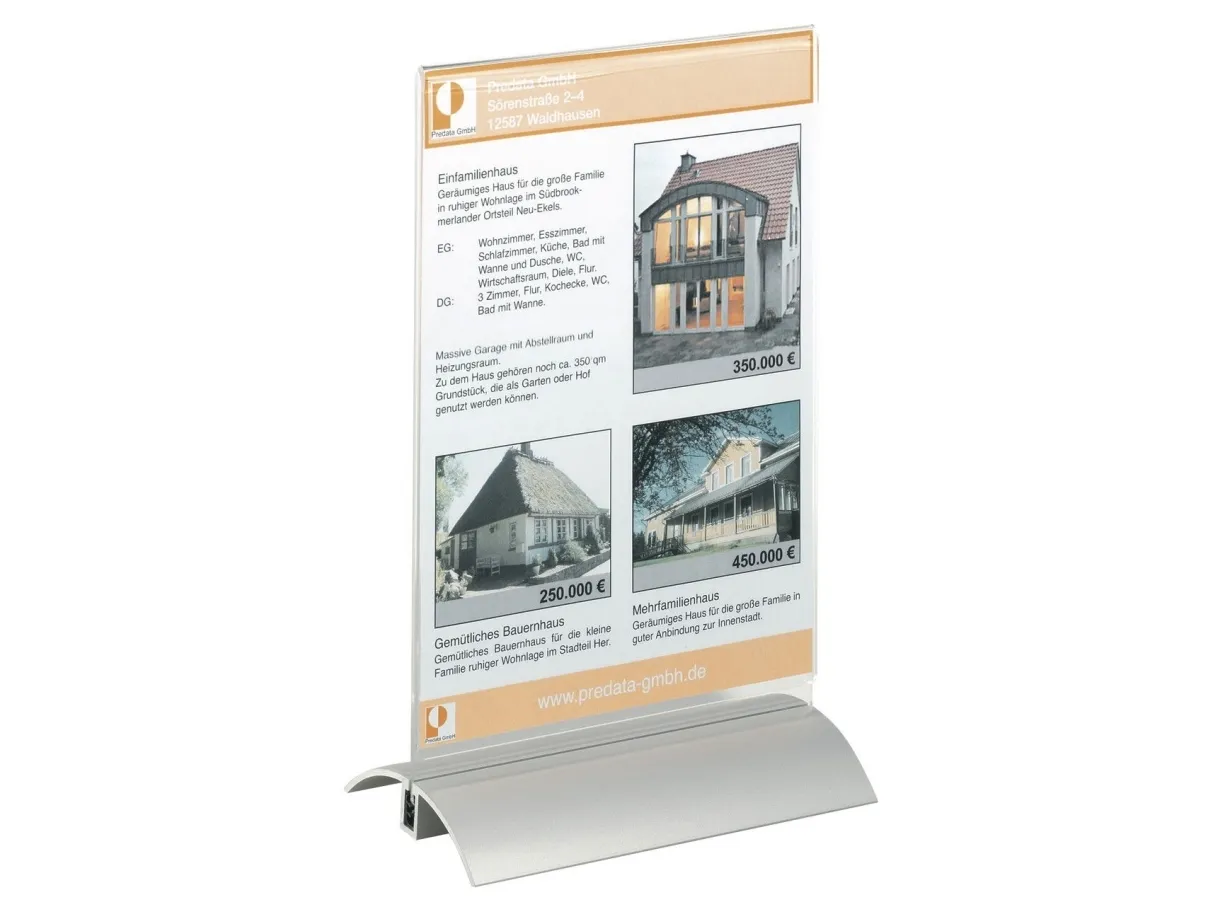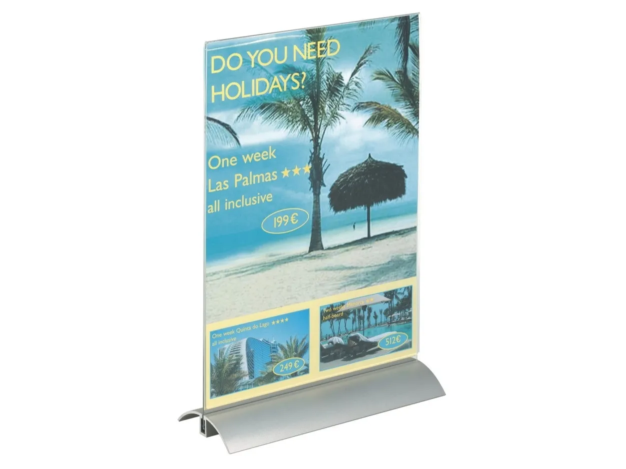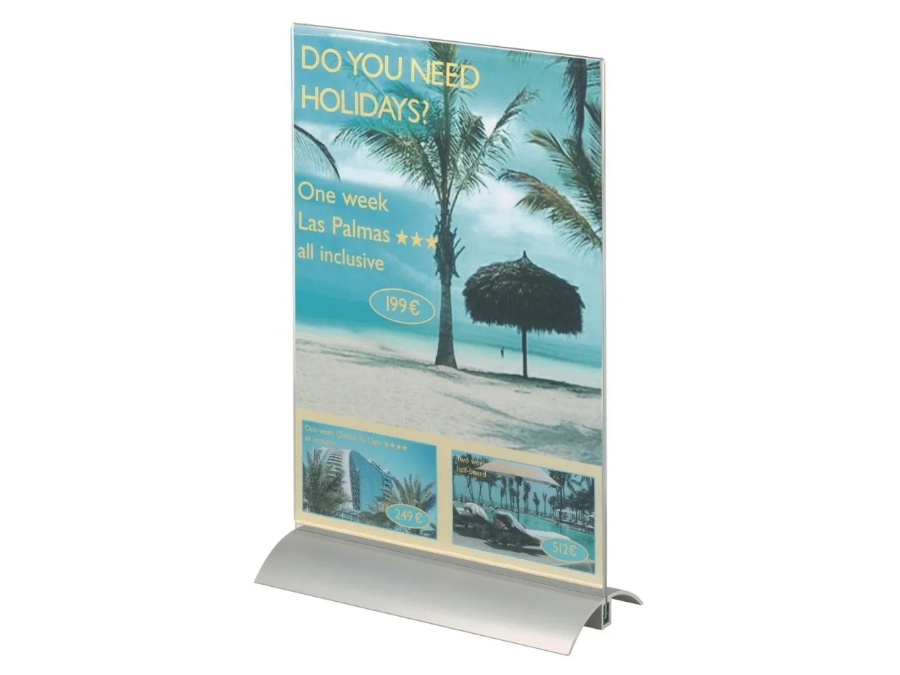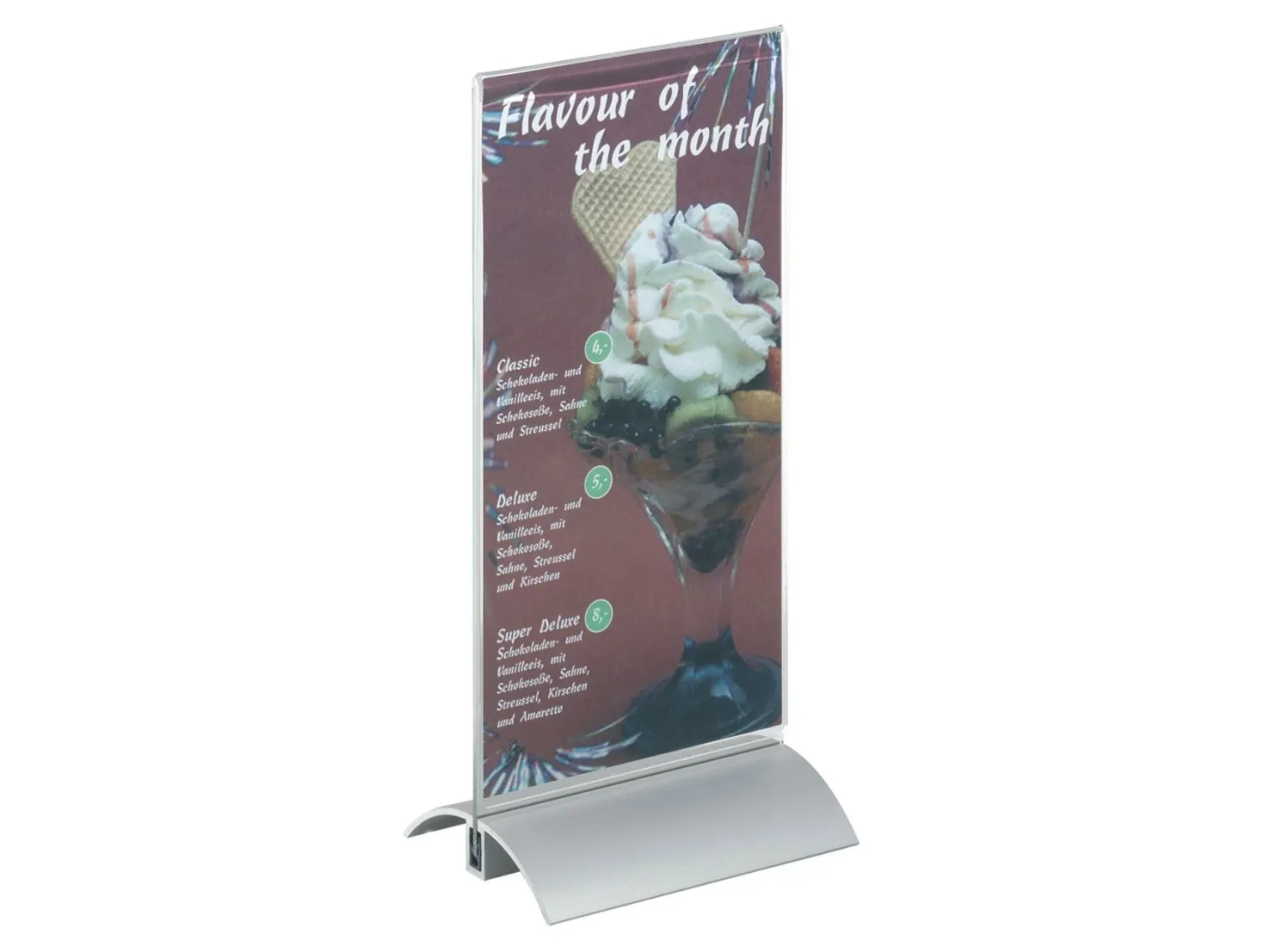 Elegant informationsställ för skyltning av t ex menyer eller priserbjudanden. Transparent skylt i akrylplast som är läsbar från två håll och fot av aluminium. Enkelt att byta insticksark. Mått: 150 x 214 x 85 mm (BxHxD); A5