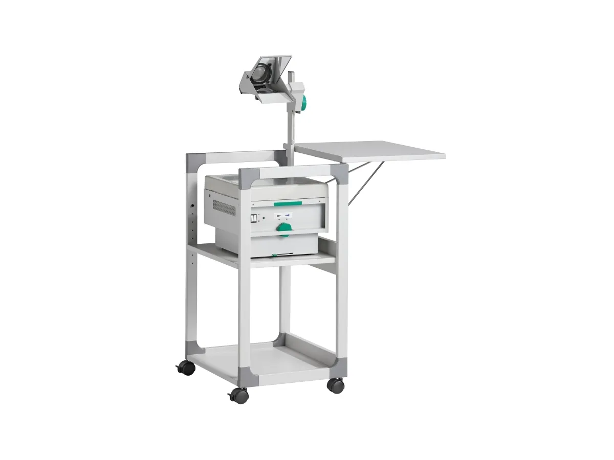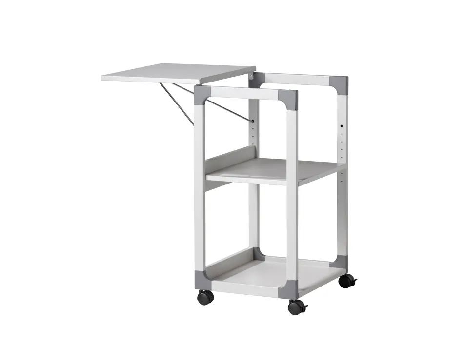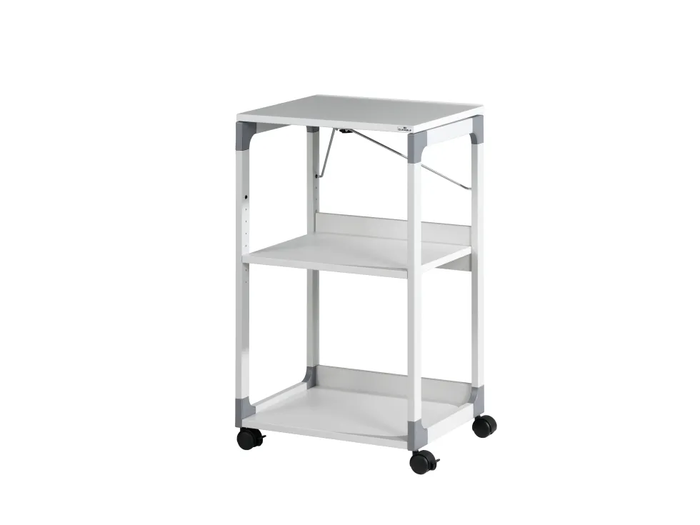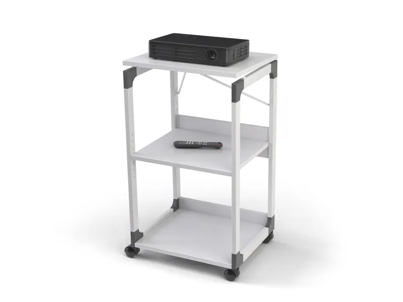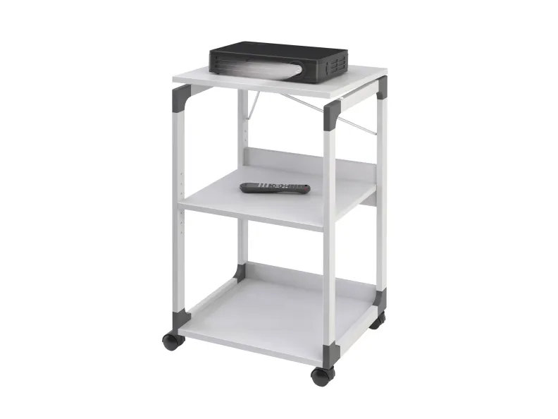 Three level overhead projector trolley. The lid is adjustable to help accurately angel the projection. When in use as a OHP trolley the top lid can be turned 180 degrees to carry the OH sheets. The top shelf is removable and adjustable. The middle shelf is height adjustable via steps of 32 mm and the bottom shelf is fixed. All shelves are 19mm thick. Designed with a strong metal powder coated frame and glass enforced plastic corners. Top shelf dimensions: 508 x 432 mm (W x D) Middle shelf dimensions: 468 x 413 mm (W x D) Bottom shelf dimensions: 468 x 413 mm (W x D) Dimensions: 882 x 508 x 432 cm (H x W x D)