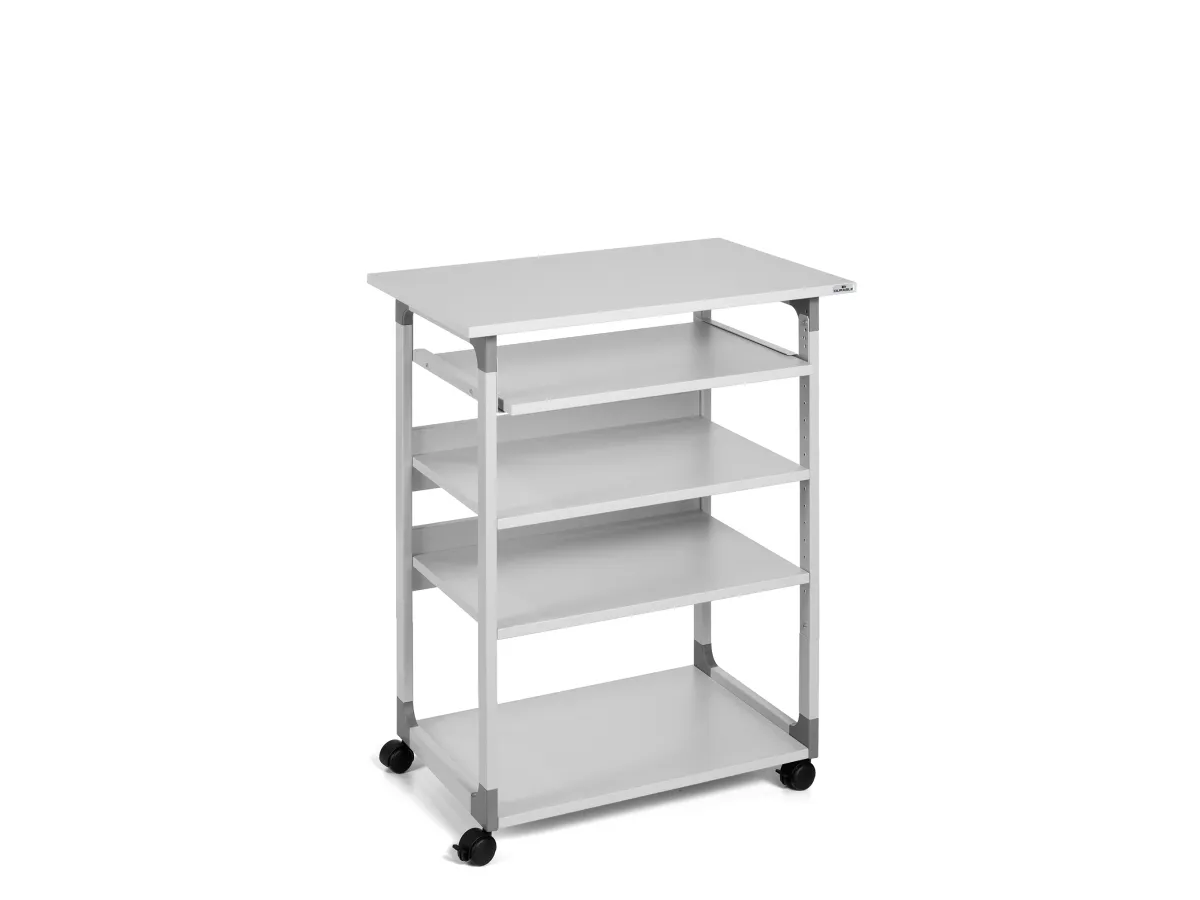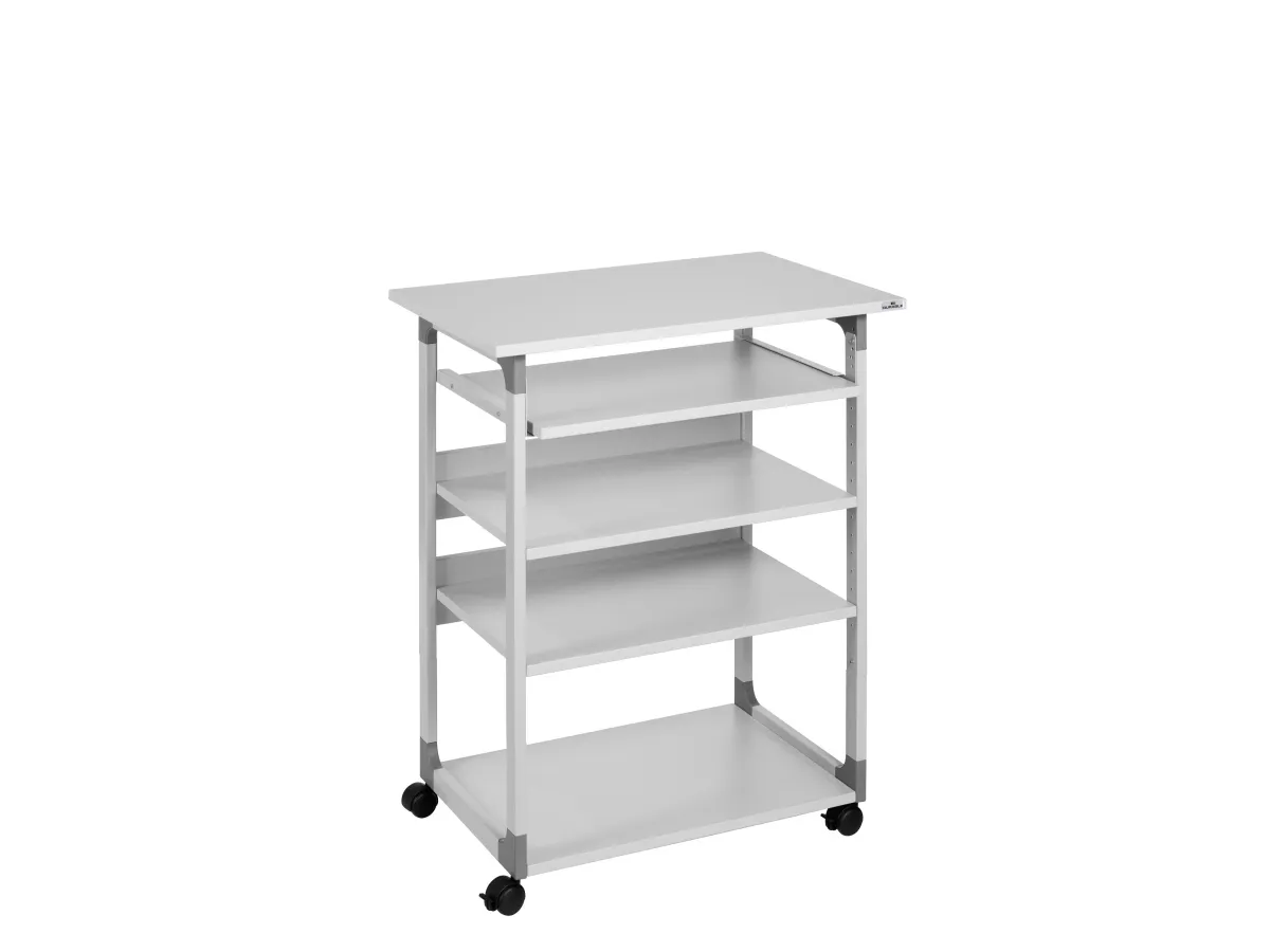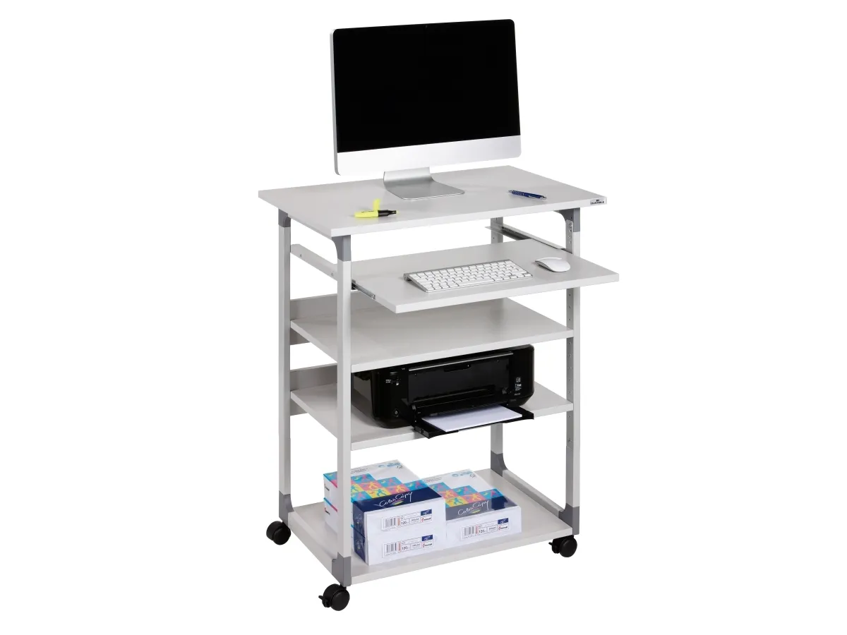 Datorbord med robust ram av reptåligt stål med hörn av glasfiberförstärkt plast. Hyllor av 19 mm tjockt melaminträ. Skärmhylla (750x534 mm) kan justeras i höjdled mellan 950-1150 mm i steg om 2 cm. Tangentbordshylla (586x420 mm) kan justeras i höjdled upp till 1005 mm i steg om 3 cm för att få en bekväm arbetsställning. Två mellanliggande hyllor (610x434 mm) med horisontell ås kan justeras i höjdled i steg om 3 cm. Med fyra hjul, varav två är utrustade med bromsar för stabilitet under användning. Levereras platt förpackad med monteringsanvisning. Mått: BxHxD 750x950-1150x534 mm. Bottenhylla 610x464 mm.
