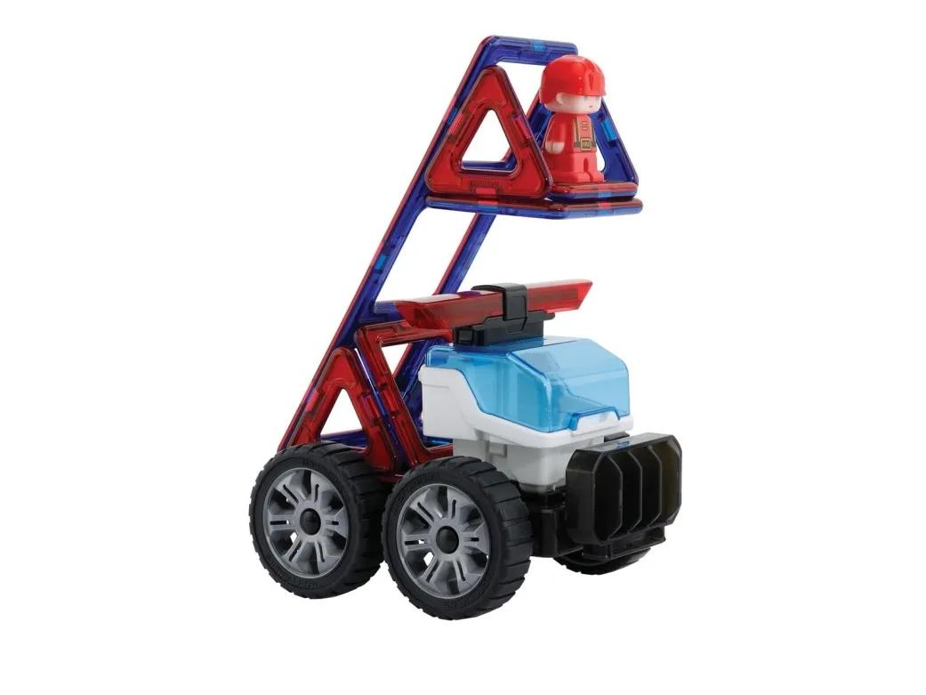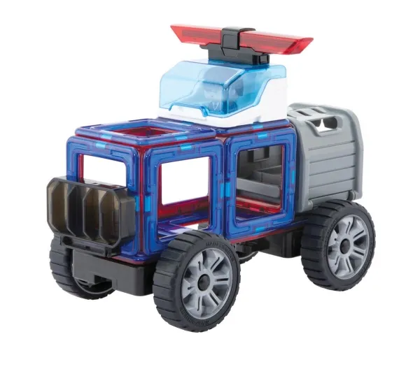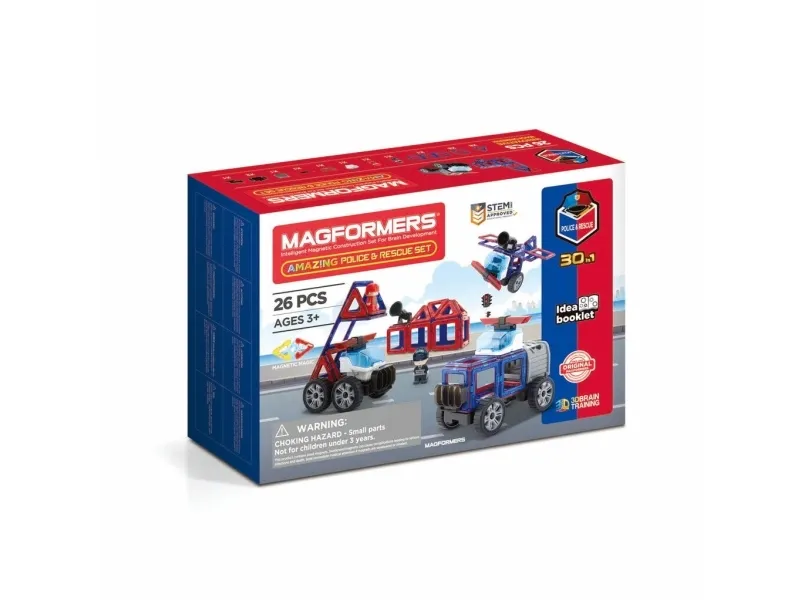 Denna 26-bitars magnetiska konstruktionsset från prisbelönta Magformers kombinerar 13 magnetiska former med 13 nya tilläggsstycken för att skapa en hel lekvärld för polis och brandräddning. Supercoolt och mycket kreativt. Med hjälp av de magnetiska geometriska formerna och extrabitarna, kan barnen skapa massor av olika spännande byggnader på beredskapstemat och utöva rollspel genom att använda de nya bitarna. Dessa inkluderar ett ”siren/ljusblockstycke” som förvandlas till propellerblad, en förarhytt/cockpit, container/cell och brandmansstänger/fönstergaller. Med nya brandman- och polisfigurer är detta magnetiska lekset ett måste för kreativa barn som älskar byggleksaker och räddningstjänsten. Det finns också en ny magnetisk hjuldesign som klickar ihop - så att du kan skapa en stark, kort hjulbas genom att koppla ihop hjulen - eller använda den magnetiska trippelkvadraten (rektangel) för att skapa en längre hjulbas! Med Magformers polis- och räddningsset kan du tillverka över 30 olika modeller - fordon och byggnader - som är fullt kompatibela med alla andra Magformers-set.