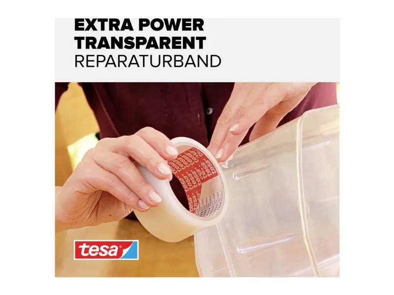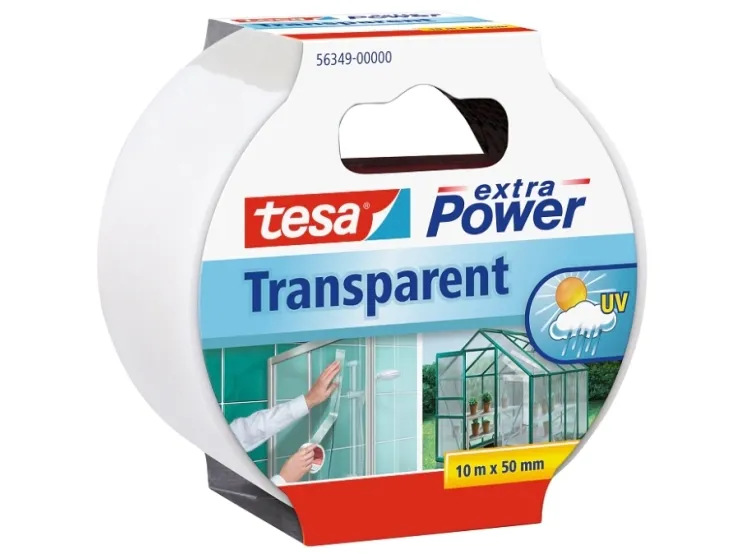 tesa® extra Power Transparent is a fabric tape designed to offer extra resistance in indoor and outdoor applications. It not only guarantees superior adhesion on a wide range of smooth and even rough surfaces. It is also weatherproof and waterproof duct tape and therefore matches many outdoor situations. Plus it is able to withstand many solvents. Use it as a transparent waterproof tape for convertible tops or a quick and reliable repair tape for repairing cracks in acrylic glass. Count on age-resistant adhesion for temporary and long-time use.\n\n- Excellent adhesion to many types of surfaces, rough or smooth\n- Strong, ageing-resistant adhesive\n- Weather- and waterproof\n- Very good resistance to solvents\n- Ideal for repairs on transparent plastic material and temporary repairs on cracked glass