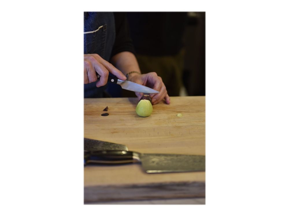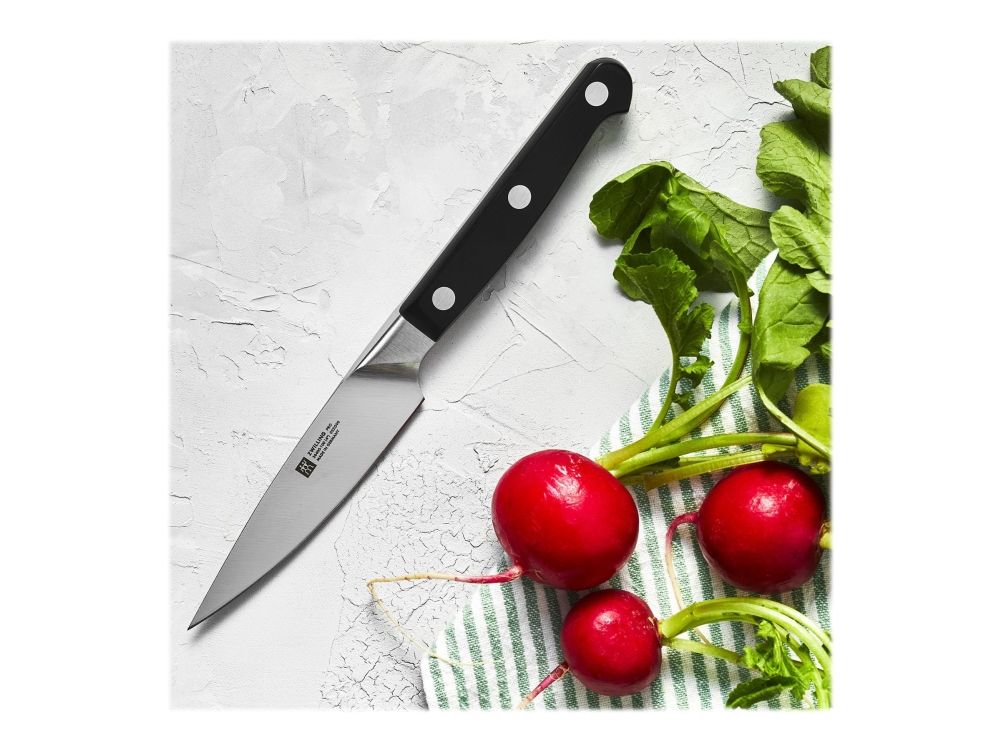 ZWILLING Pro is the most user-friendly knife available to market. The unique blade shape and ergonomic bolster are the result of many years of experience in knife making, and the rigorous study of how knives are used. A curved bolster supports the professional pinch grip, with thumb and index finger on the blade, for safe cutting and less fatigue. The full length of the blade can be used when cutting and can be sharpened from bolster to tip. The ZWILLING Pro Paring Knife is a small knife with a strong blade and center tip. It is ideal for cleaning, peeling and cutting small fruits and vegetables.