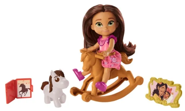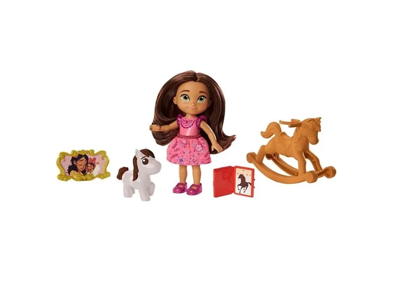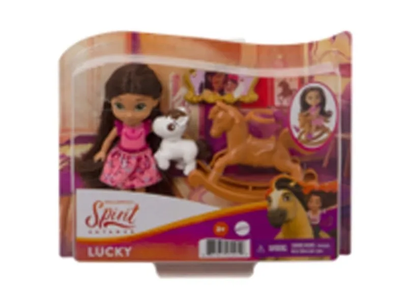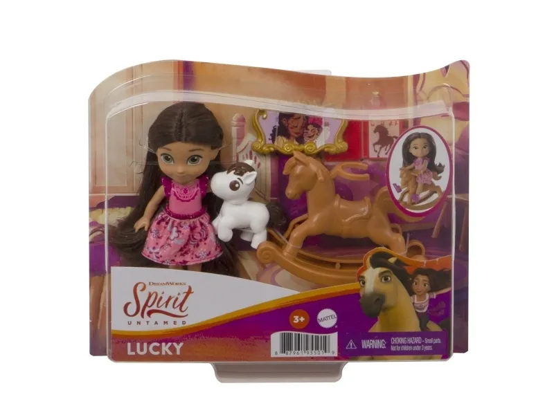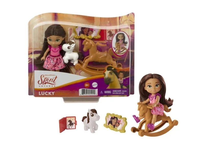 Följ med på vänskap, skoj och äventyr från DreamWorks animerade film Spirit Untamed! Den 10 cm stora Lucky-dockan i söta rosa kläder är Lucky som liten flicka. Den här Lucky-dockan har också 5 rörliga leder - perfekt för olika positioner och lekar. Extra tillbehör gör det möjligt att skapa många historier. Du får några av Luckys favoritleksaker - en gunghäst (dockan kan klämmas fast på), en liten hästkompis, en inramad bild på Lucky och hennes mamma och en liten låda. Spela upp de många underbara scenerna från filmen med den här fina dockan och tillbehören som inspirerats av filmen.