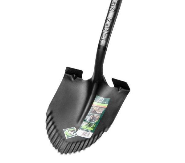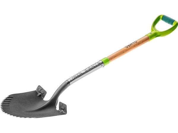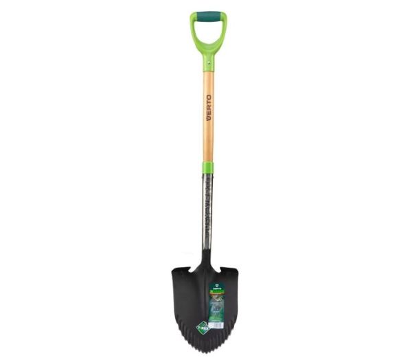 Sharp spade VERTO (ref. no 15G001) total lenght 1150 mm. Dedicated to garden and construction works. Blade made of hiqh quality hardened steel with sharply pointened serrated edge that allows easier digging in rotted or stone ground. Hardened wooden handle with bimaterial comfortable ergonomic plastic grip. Strengthened part of the handle which is most liable to damages. Wide suport places for feets.